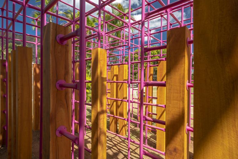 Descriptively, the pink Labyrinth has 55 African mahogany pillars that flank six corridors. In the north-south direction, they are wide and the passage is easy; in the east-west direction they are narrow and the passage is more difficult. Above the pillars is the space grid of 1 ¼” metal tubes, which is the jungle gym.
