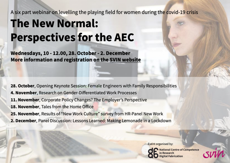 This 6 part-webinar, organized together with the SVIN, NCCR Digital Fabrication explores the question of what the “new normal” is for Swiss women working in the Architecture, Engineering and Construction industry. This series is based on exchanging experiences and strategies to create a better “new normal”. Practitioners and academics will discuss current and potential solutions for improving policies to better balance work and private life. The webinar will be held in English.