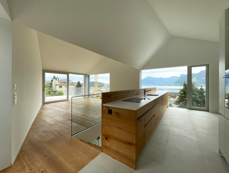 Die Lage des dreieckigen, schmalen Grundstücks ist gegen Osten geprägt durch eine herrliche Aussicht auf den Vierwaldstättersee, im Westen grenzt es unmittelbar an die Autobahn. Davon ausgehend wird das Raumerlebnis entwickelt mit einem über drei Geschosse organisierten Wohnen.