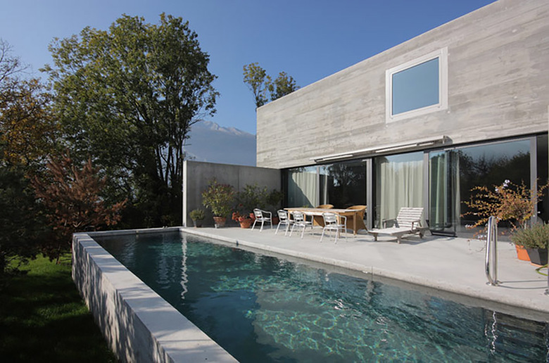 Trotz Eingrabung des Hanggeschosses in den Berg bleibt dessen Dimension von allen Seiten des Gebäudes ablesbar. Es bildet zusammen mit dem Pool eine Plattform für den Wohnbereich des darüber liegenden Erdgeschosses, welches, als Raumklammer konzipiert, den privaten vom öffentlichen Raum abgrenzt. Einblicke von der Strasse her werden konsequent vermieden. Die mehrfach geknickte Sichtbetonwandscheibe stellt nicht nur den Raumabschluss des Erdgeschosses dar, sondern verbindet darüb