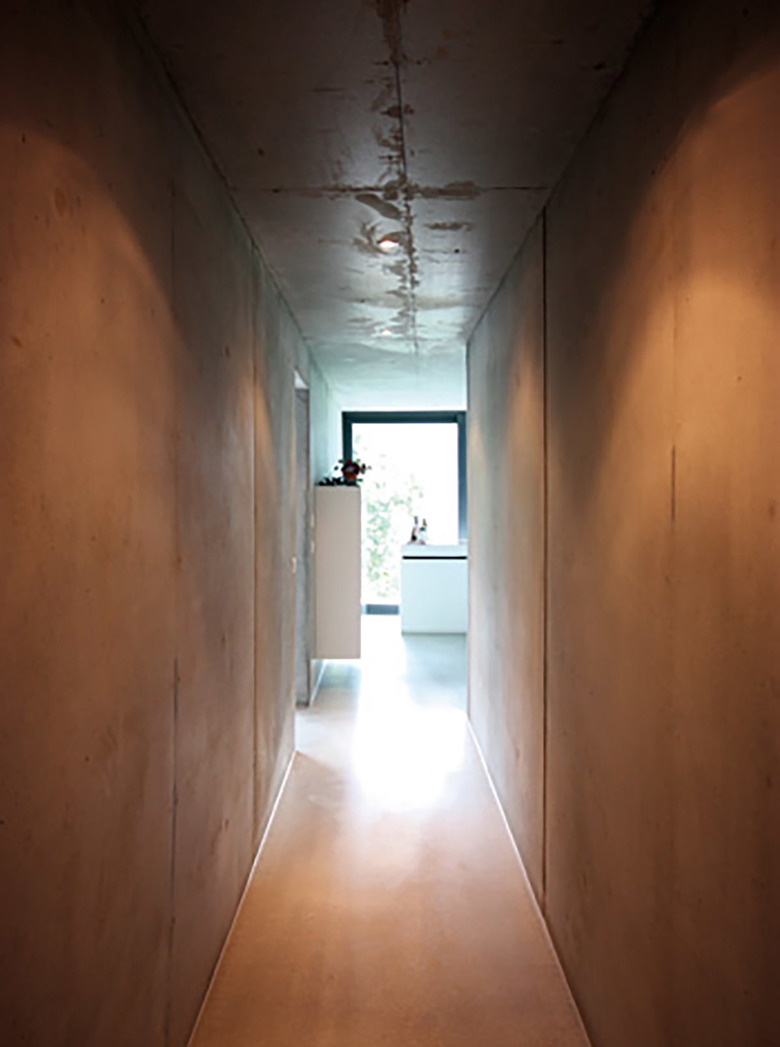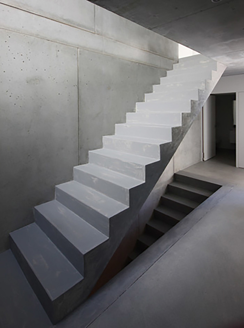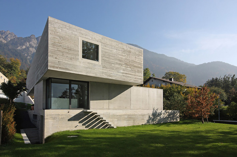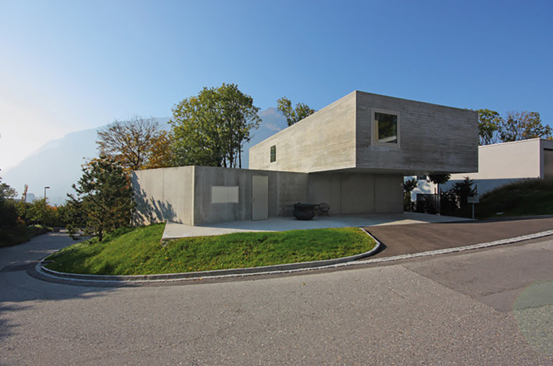 Aufgrund des Strassenverlaufs rund um das geneigte Baugrundstück und der Bedürfnisse der Bauherrschaft nach Privatheit entstand dieses zunächst introvertiert, fast abweisend wirkende Einfamilienhaus. Drei in der Grundrissanordnung unterschiedliche Geschosse werden zu einer zusammenhängenden Sichtbetonskulptur gestapelt. Die Anwendung von Ortbeton mit zwei unterschiedlichen Schalungstypen und die damit differierende Oberflächenstruktur fügt die unterschiedlichen Geschosse zu einem Ganzen und unterstützt die Skulpturalität des Gebäudes.
