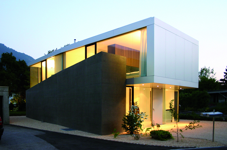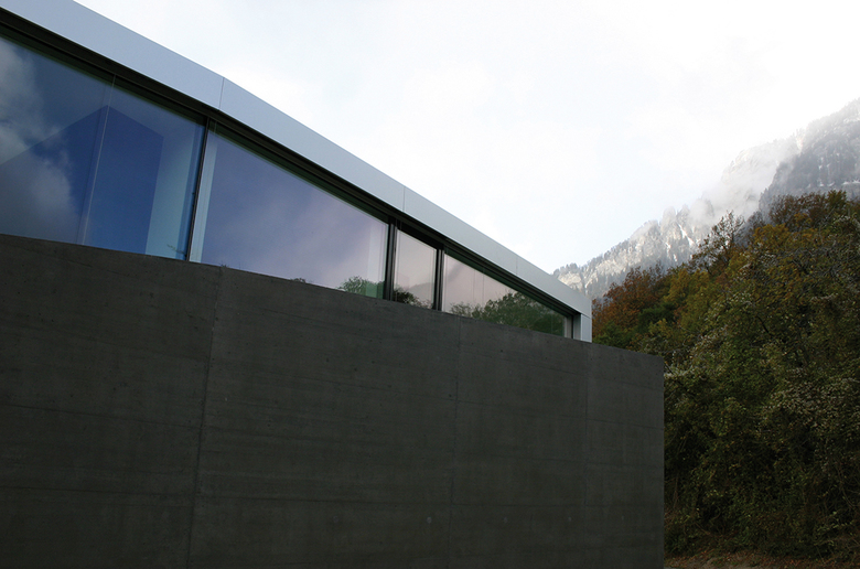 Neben einem eindrücklichen Sichtbetonhaus aus den 1970er Jahren wünschte sich die Bauherrschaft ein kleineres, nicht minder spezielles Haus als «Alterstöckli». Trotz der unmittelbaren Nachbarschaft sollte das neue Gebäude dem alten Haus nicht zu nahe treten, um dessen unbestrittene Qualitäten nicht zu mindern und die nötige Abgrenzung zu wahren. Der Neubau wird aus diesen spezifischen Besonderheiten des Ortes sowie aus der Form der Restparzelle entwickelt: Eine Schale aus eingefärbtem Sichtbeton bildet einerseits ein introvertiertes, privates Erdgeschoss mit einem Atrium ähnlichen Aussenraum und andererseits eine räumliche Grenze zum verkauften Grundstücksteil. Die Betonschale verläuft mehrfach abgewinkelt und umfasst nahezu die gesamte neue Parzelle. Die Eingangsfront an der Nordseite ist ohne «Schutzmauer», hier empfängt ein verglastes Entree die Besucher mit Offenheit. Aus der Betonschale heraus ragt das grossflächig verglaste Obergeschoss, mit herrlicher Weitsicht beidseitig ins Tal. Die Materialisierung im Inneren folgt der Logik des Grundkonzeptes des Hauses. Die Decken sowie die tragenden Betonwände sind weiss gestrichen. Die Vorsatzschalen, d. h. die Bereiche der Innenisolation, thematisieren jedoch das Auskleiden: Der Gips wird roh belassen und bildet mit dem Anhydritboden, welcher durch das schwimmende Einbringen ebenfalls als Auskleiden interpretiert wird, eine Einheit. Zusammen mit den Materialien des Innenausbaus und der Möblierung ergibt sich ein stimmiges Farbkonzept, welches präzis dem Fügen der verschieden Bauteile entspricht, aber auch auf der vorhandenen Möblierung der Bauherrschaft aufbaut.