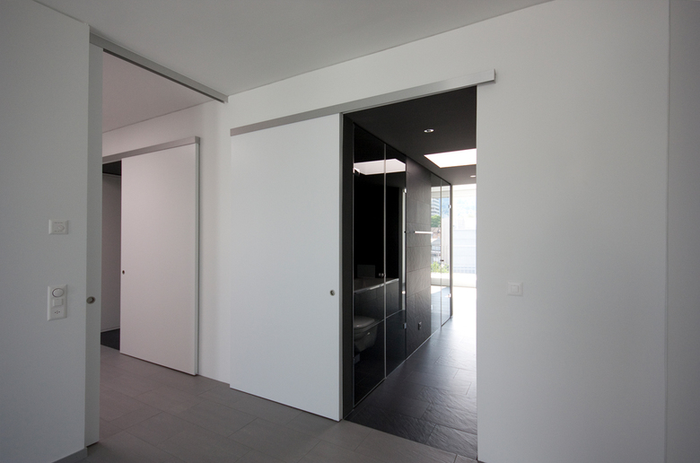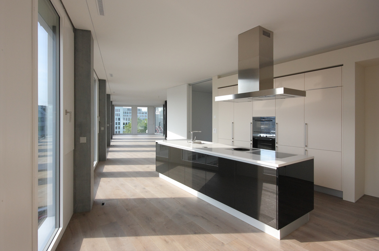 Es wurden verschiedene Innenausbaukonzepte entwickelt, die je nach Bauherrenentscheid in die geschaffene Struktur eingesetzt werden können: für die Büronutzung ein Dienstleistungs-/Büromodul, für den Wohnungsbau ein Standardwohn- und alternativ dazu ein Loftmodul. Beide Wohnmodule spielen mit der zweiseitigen Ausrichtung der Wohnung, jedoch mit verschiedenen räumlichen Aussagen: während mit dem Loftkern und dem Umfliessen eines zentralen Körpers ein gängiges Raummodell umgesetzt wird, spielt der Standardkern mit einem trennenden Element als Verbindung der beiden Wohnungsseiten.