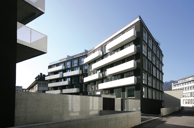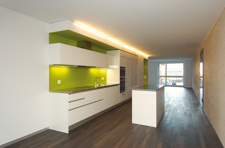 Sämtliche Wohnungen weisen mit je einer Hof- und einer Strassenseite eine zweiseitige Orientierung auf. Dies geschieht primär über den Wohn-/Essbereich. Die Nasszellen unterstützen in ihrer Anordnung und Ausbildung auch hier das Thema des «Durchwohnens»: Das Bad wird in die Zimmerschicht integriert, so dass eine zweite durchgängige Sichtverbindung entsteht. Dies erzeugt eine Grosszügigkeit und räumliche Vielfalt auch bei den kleineren Wohnungen. Die Badlandschaft sowie die Küchen werden als Nischen in den zentralen Nasszellenkörper eingeschnitten. Dieses räumliche Konzept wird mit zwei Ausbaulinien umgesetzt: die eine arbeitet mit der Struktur und Oberfläche von Materialien, die andere mit dem Thema Farbe und Beschichtung.