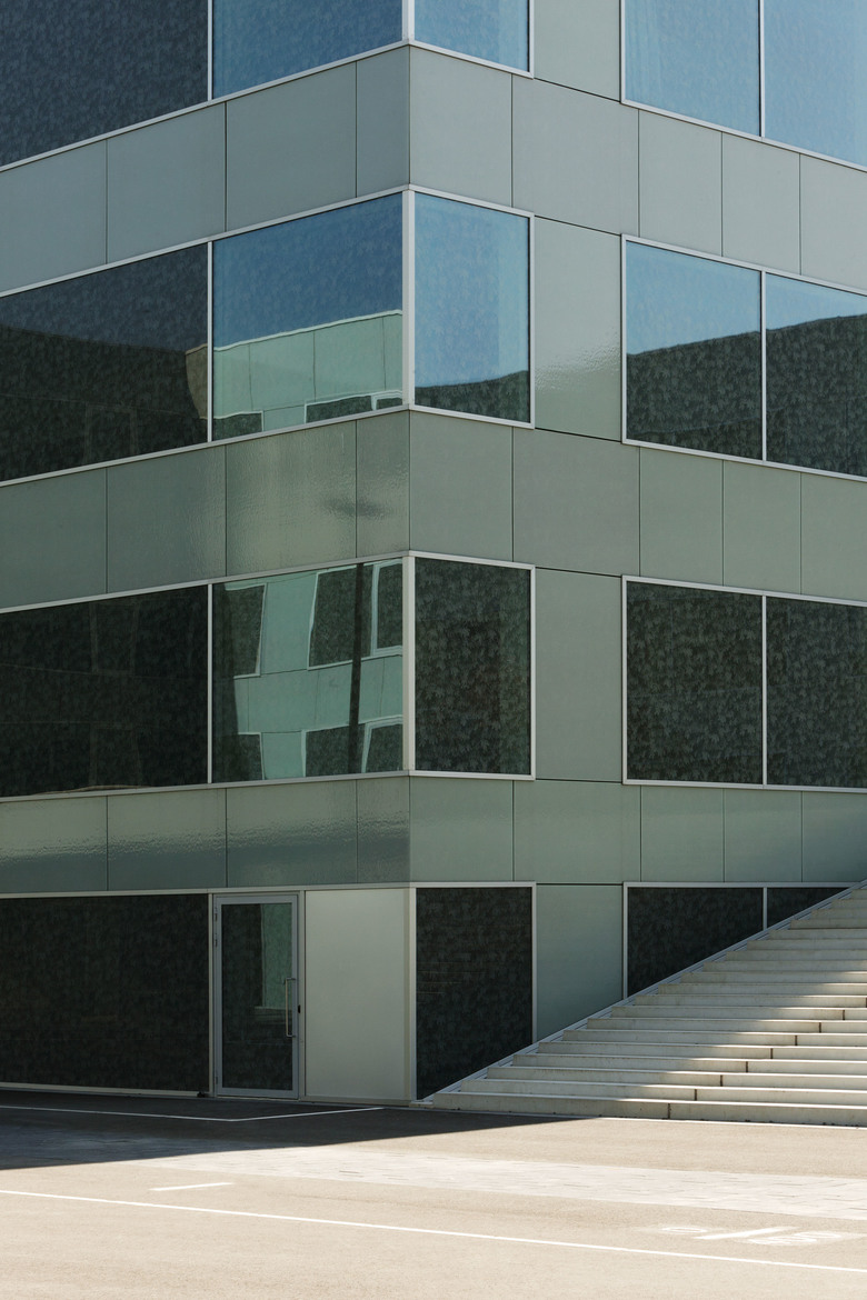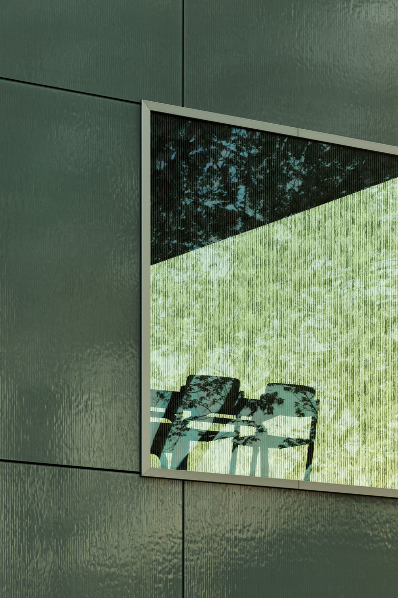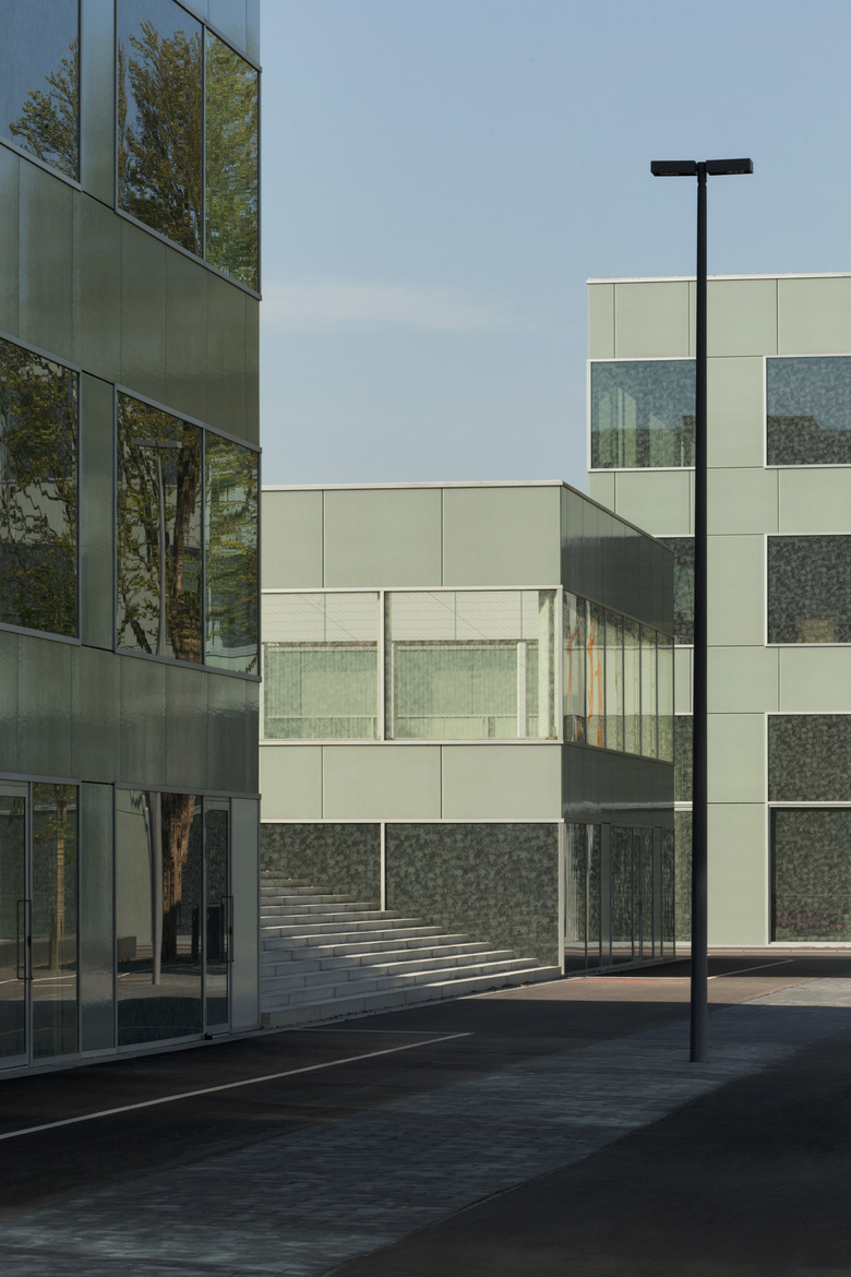 Load-bearing façades with open corners–combined with concrete cores for stability, and non-polished concrete floor slabs under tension–structure each building. Cores are notable for their concrete relief, derived from an enlarged pattern of the fritted ivy, adjacent to which are each building’s shifting sets of staircases. Balustrades are finished with colored glass, and each building has a unique color, to impart a visual identity within each. Custom-designed white terrazzo seating dots the campus’ programmed tarmac, and Japanese Maples set in custom-designed black terrazzo planters dot each fenced terrace. The entirety of the programmed tarmac, and every terrace, are illuminated at night to ensure the surrounding community’s cohesiveness. Unity defines the campus–and its clustered buildings–which are therefore experienced as continuous architecture.