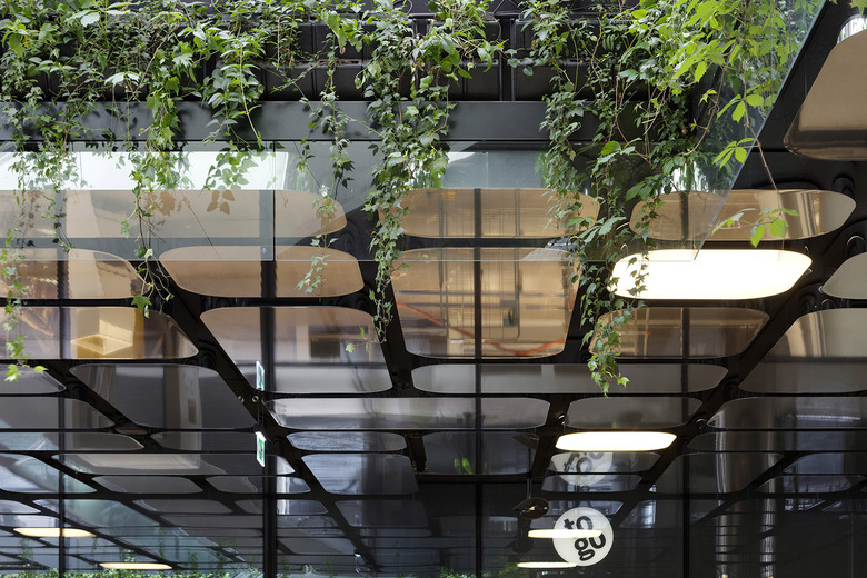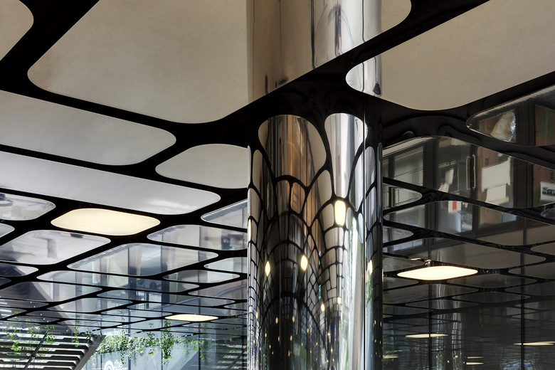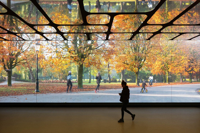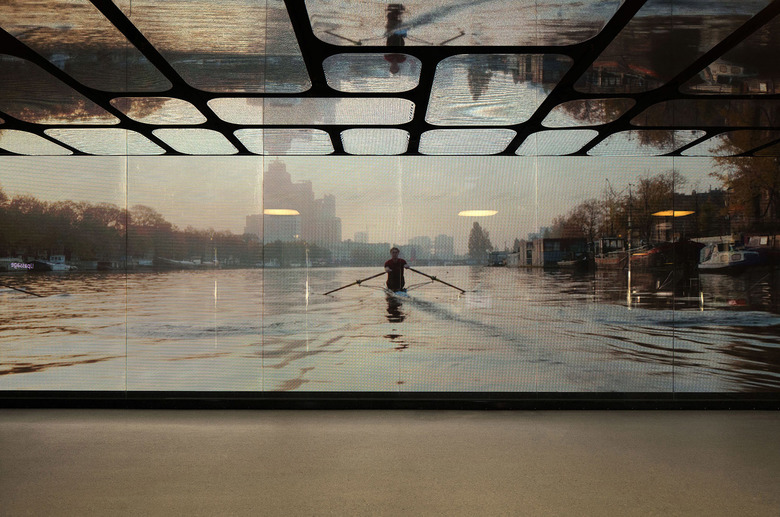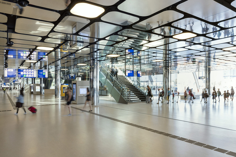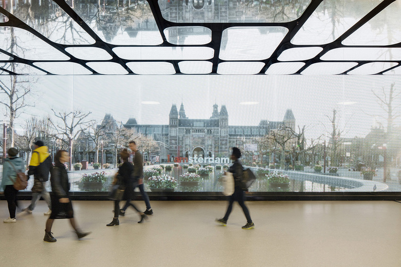 Outfit with enormous LED screens, which continually transition their displays between voyeuristic, calming scenes of the city–and alternatively, advertising–and set with a golden-yellow-tan hued terrazzo floor; the multifaceted interior passage is meant to encourage constant pedestrian movement, simultaneously remaining durable under the foot traffic of tens of thousands of travelers each day. A system of modular, rounded mirrored elements adorns the IJhal’s ceiling, arranged in a playful grid that introduces a sense of movement to the ever-shifting reflections from below, communicating in tandem with the mirrors that wrap the passage’s load bearing poles, which dot the IJhal’s main axis. All of these mirrored elements cast the radiating, ever-undulating fluctuations of the IJ's surface reflections in the IJhal so they refract into the adjacent passageways, in a nod to Amsterdam’s, historic, deeply intertwined relationship to water.
