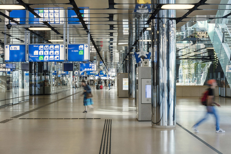 Terrazzo, in addition to its use on the IJhal’s floor, was also chosen for the custom way-finding signage holders, and the many photo-booths that align the IJhal’s main pedestrian axis, enabling a visually cohesive language to emerge. Simultaneously, the signage of each shop and restaurant has been integrated into the walls of glass that front all such ‘interior’ spaces in the IJhal, with each lit from behind, further brining unity to this otherwise frantically busy location within the station. A series of secondary passageways perpendicular to the IJhal impart direct visual connections to the waterfront, throughout the entire station. Notions of transparency and reflection within the IJhal, seek to reestablish Amsterdam’s connection to its northern neighborhoods, which were severed from the city’s center, upon the train station's completion, in 1889.