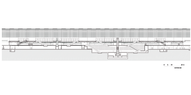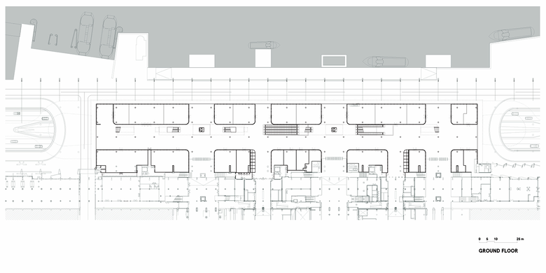 Shops align the IJhal’s southern edge, while strung along its northern is a series of restaurants; the latter’s situation within the project, along its water side, enables views toward the water of the IJ while dining, and the observation of a constant stream of cyclists passing by, on the new bike ‘highway’ that runs parallel to the river IJ. Staircases within rectangular voids connect the IJhal to the regional bus terminal above, with waves of winter-hearty, undulating ivy gardens, whose growth spills over and into the voids from above–introducing a gentle, natural element, within this highly chiseled, and otherwise extremely durable area, which must daily accommodate tens of thousands of travelers. Escalators below every bus staircase will eventually lead to the train station’s metro stop, and platforms for the North-South line, which runs under the station, perpendicular to the IJ; this metro will eventually the city’s visitors and residents to bypass its tram system and instead use this metro, if venturing south of the station toward the city.