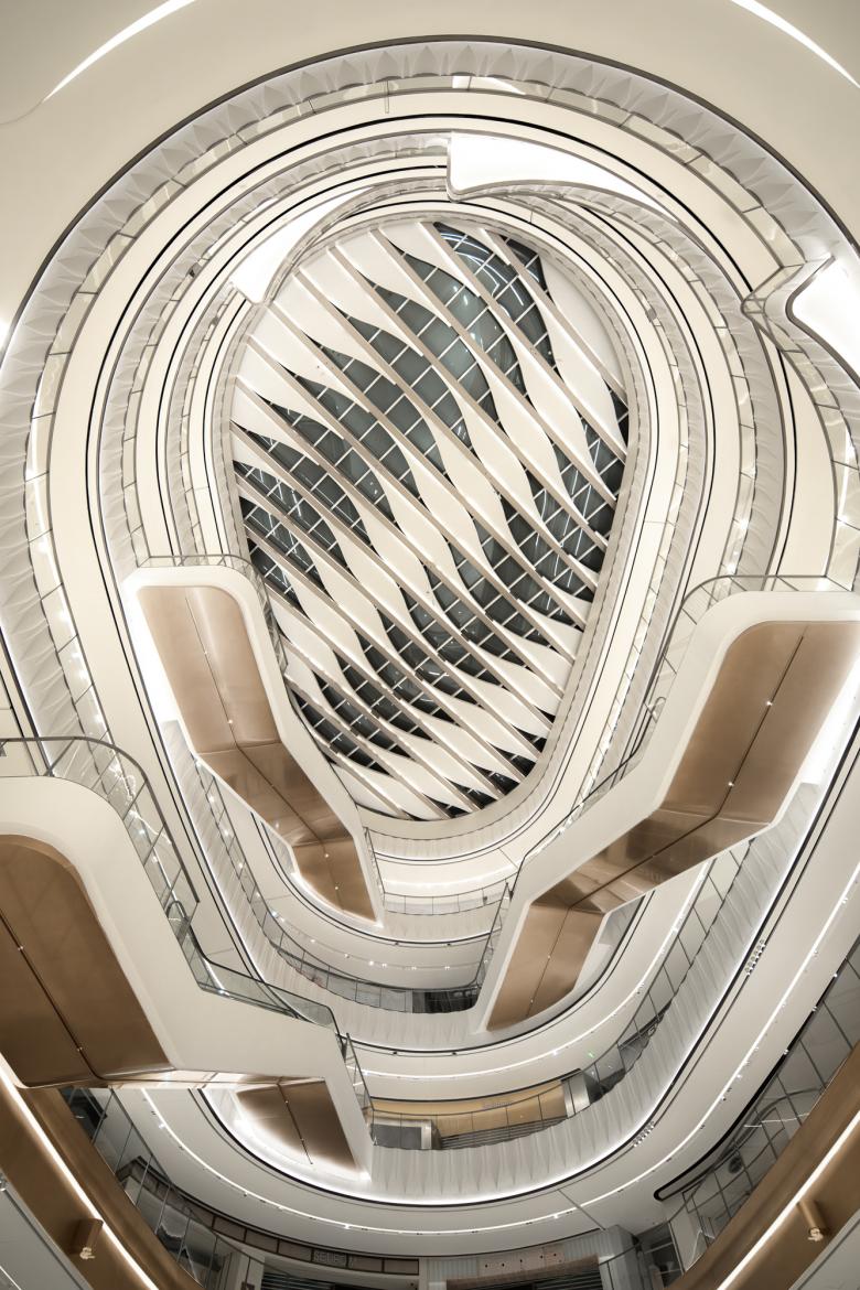 Encompassing two large wings with a centrally located lobby, the design features light, bright finishes alongside curved void edges, accented with modern recessed lighting. The wave-like shapes of the viewing balconies evoke the rolling hills of tea mountains and surrounding nature. The main atrium’s centrepiece is formed by two glass bridges that are illuminated, giving the appearance of a crystal.