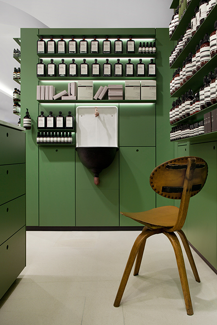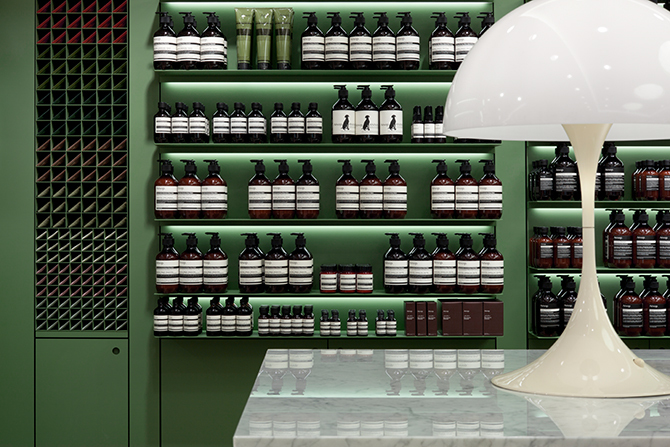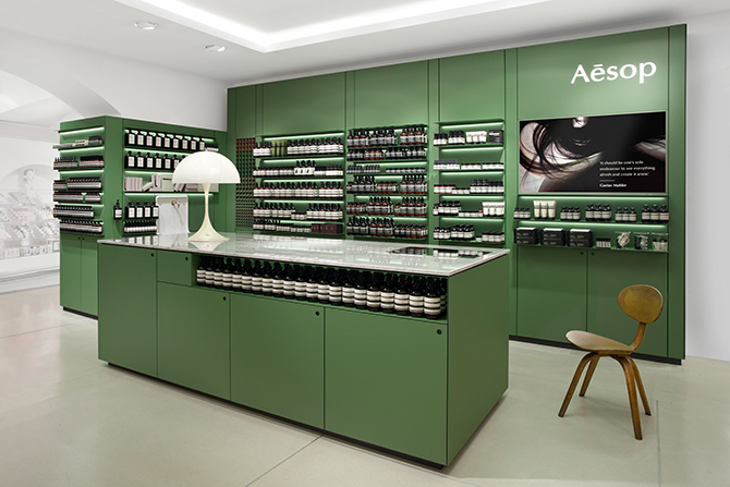 A new counter in Munich’s Ludwig Beck Department Store follows distinctive partnerships in Stuttgart, Bern and Lausanne. Employing measured restraint in material and palette, the central counter and surrounding shelving units are clad in soft-hued Reseda green powder coated metal, affording welcome respite from the busy surrounds. A streamlined countertop of dark Carrara marble affords the space contrast, while a vintage Louis Poulsen Panthella Table Lamp and a Hugues Steiner Bow-Wood No. 3 chair offer pleasing accents. Customers can explore and select from a complete range of skin, hair and body care products, distinguished by botanical and laboratory-generated ingredients of the highest quality.