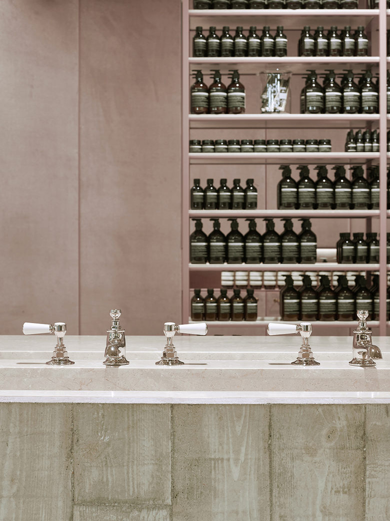 Centrally positioned in the main room, an outsized concrete point-of-sale counter complements a tiered concrete ceiling and screed floors; collectively, these Brutalist elements resonate with the architecture of the neighbourhood. A marble top and recessed marble sink contrast the counter’s monolithic austerity and soften the interior’s atmosphere. In the adjoining space a rounded concrete sink affords extended consultations, while vintage furnishings invite repose.