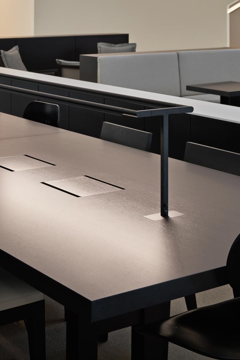 A spacious atrium in Engel & Völkers’ Hamburg headquarters hosts a hybrid between a co-working space and an exclusive hotel bar. Several islands subdivide the space into designated areas for focused work, meetings and afterwork drinks. White Corian balustrades bridge Richard Meier’s architecture with Engel & Völkers’ red and black brand signatures.