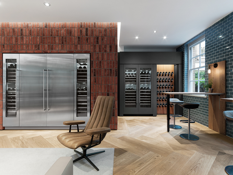 As a two storey space within a Grade II listed property, its interior design pays homage to the capital. The local ubiquitous red brick is used in the style of the London Underground tiling, setting the tone of the room; meanwhile high ceiling racks, integrated into the open space, display selected material, product and manufacturing details, revealing the exceptional quality of the materials used by Gaggenau.