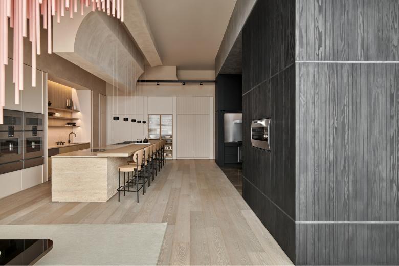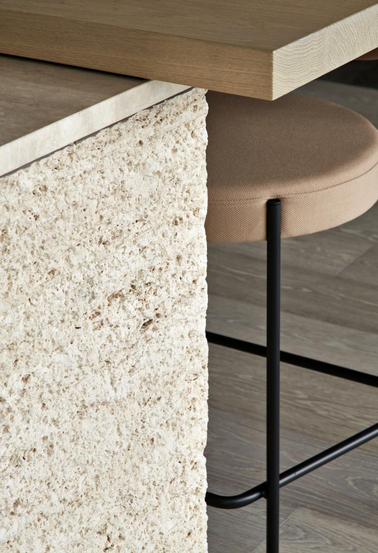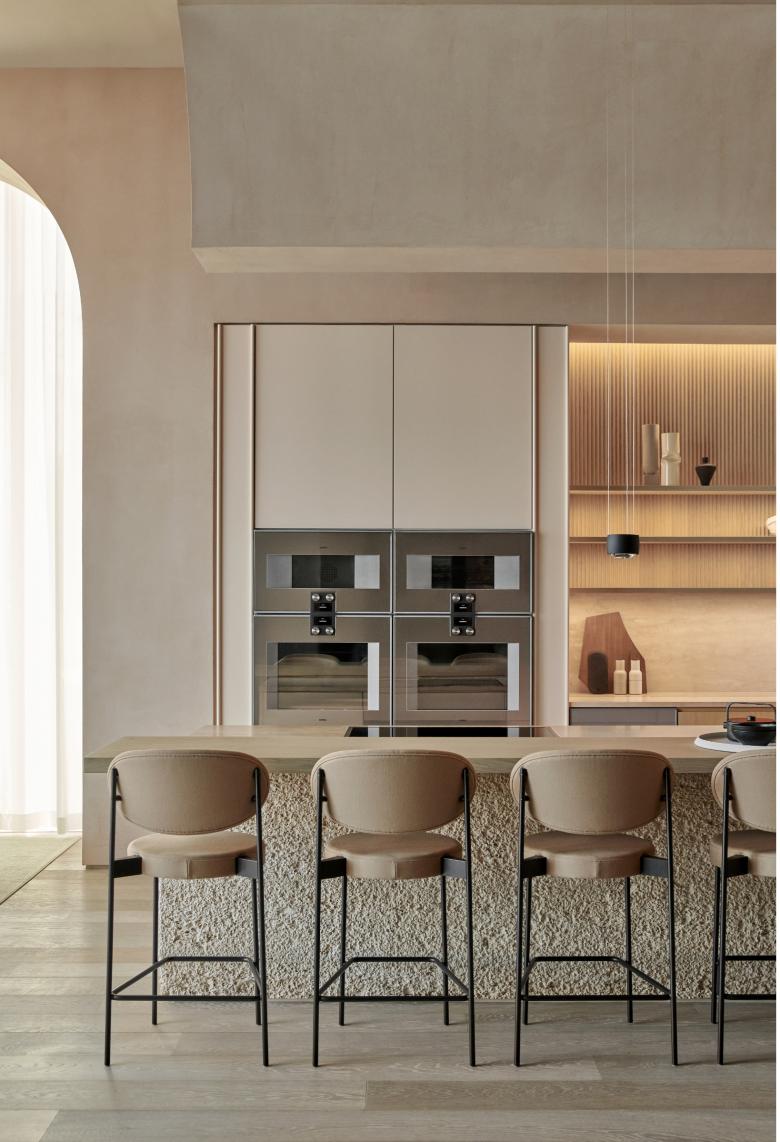 Capturing the feeling of a sunset at the beach, this showroom overlooking the bay mimics Miami with sandy hues and a split travertine island, resembling coral stone shaped by the ocean. Fragments of arches remind of Miami’s art deco architecture. A custom chandelier subtly refers to its flamingo. The Difference—here with bar—brings a more minimal aesthetic, allowing worlds to meet, and people to mingle.