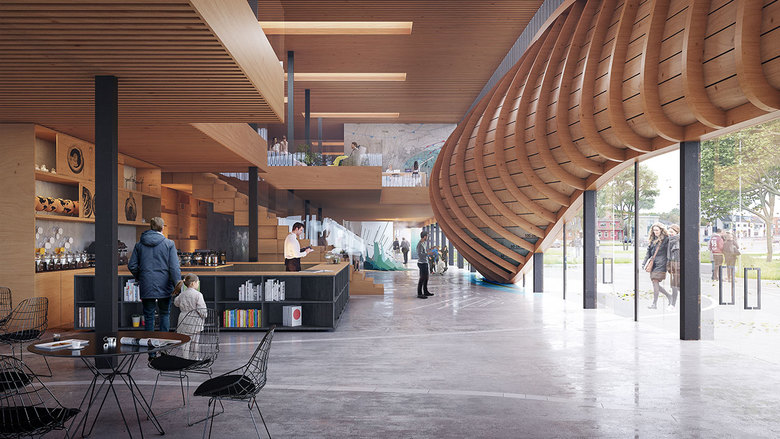 The new Climatorium will be an iconic structure in Lemvig. The wave design shapes the entrance, creating an inviting space sheltered from the elements. The building is a relatively simple two- story structure with an open glass facade on the ground floor that makes the wood-clad upper floor appear to float in the air. The height and placement of the building are carefully designed with respect to the existing buildings on the harbor front. The entrance is a wavy organic pocket built from light-toned wood, which forms a striking landmark as seen from both outside the building and from within. The motif celebrates the area’s cultural history and local building tradition, drawing inspiration from Lemvig’s characteristic fishing boats. The material selection is inspired by the nearby boat halls and creates a raw, rustic environment with wood, concrete and steel that resonates with the local environment. The ground-floor glass facade is transparent and inviting, allowing passers-by to follow the activities inside and be encouraged to explore.