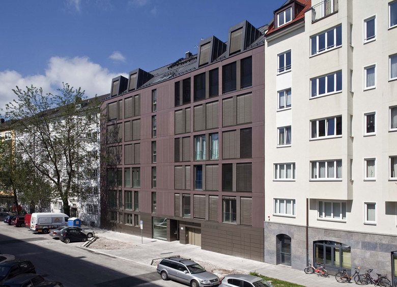 Immobilienpreis "Jung, schön und noch zu haben" 2009: "Eine gut gelöste Baulückenschließung in einer eher schwierigen städtebaulichen Situation. Trotz der sehr nahen Bestandsbebauung - auch im Hof - gelang den Architekten durch die U-förmige Staffelung eine geschickte Lösung. Dadurch konnten interessante großzügige und familiengerechte Wohnungstypologien kreiert werden. Die Wahl des Fassadenmaterials - in Form von Kupferplatten - passt sehr gut und spricht die adressierte Zielgruppe an. Das neue Gebäude kooperiert mit dem Ort und wertet seine Nachbarschaft auf."