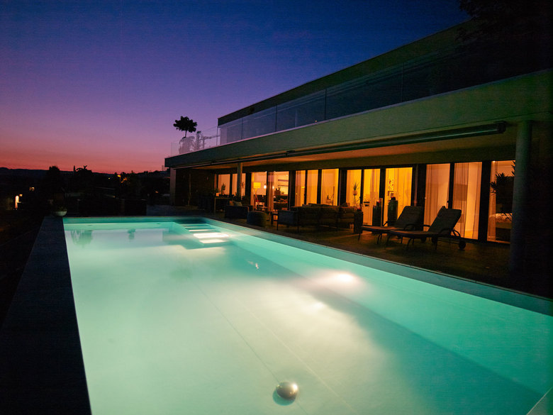 Wasseraufbereitungsanlage – Bei diesem Objekt wird das Wasser mit Aktivsauerstoff aufbereitet, anstatt mit Chlor. Das Wasser ist mit dieser Methode geruchsneutral, komplett chlorfrei, sauerstoffreich und zudem glasklar. Es wurde ein Poolmanager 4 inklusive Touchscreen von Bayrol eingesetzt.