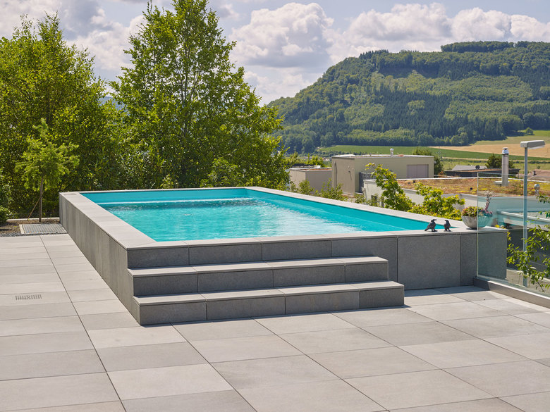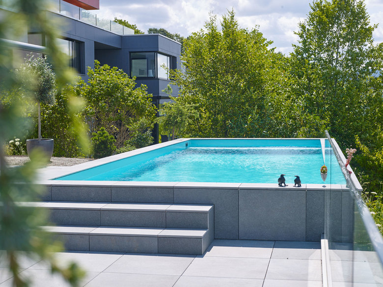 Bei diesem Schwimmbadbau, wurde das Schwimmbad auf Wunsch nicht bodeneben verbaut. Daraus resultierte ein Sitzbereich, welcher zum Verweilen am kühlen Nass einlädt.
