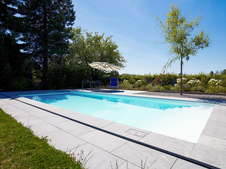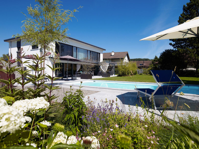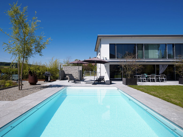 Der Traum von der eigenen Badeoase wurde perfekt umgesetzt. Das Wohnhaus wurde mit einem Gartenschwimmbad kombiniert. Die Schwimmbadtreppe verläuft über die ganze Poolbreite, was einen besonders komfortablen Einstieg ermöglicht.
