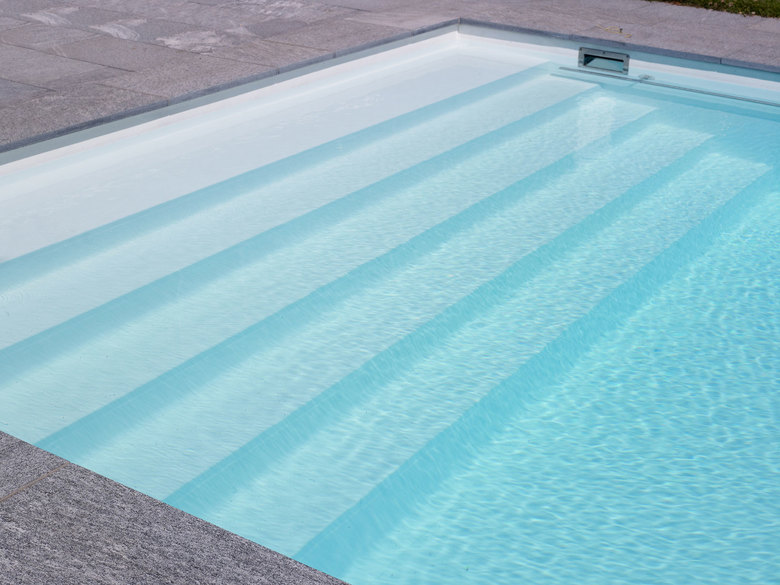 Folienauskleidung – Die hochqualitative und gewebeverstärkte Schwimmbadauskleidung ist in verschiedenen Farben und Mustern frei wählbar. Hier wurde eine weisse Folie gewählt, welche sehr gut zum Wohnhaus passt.