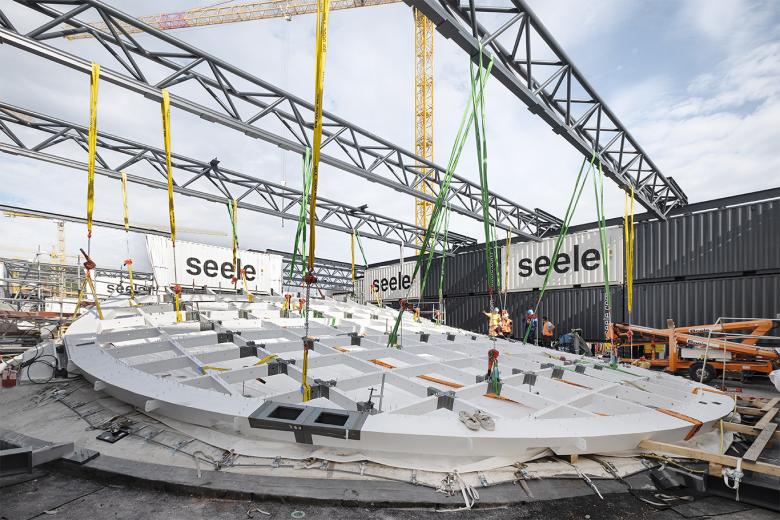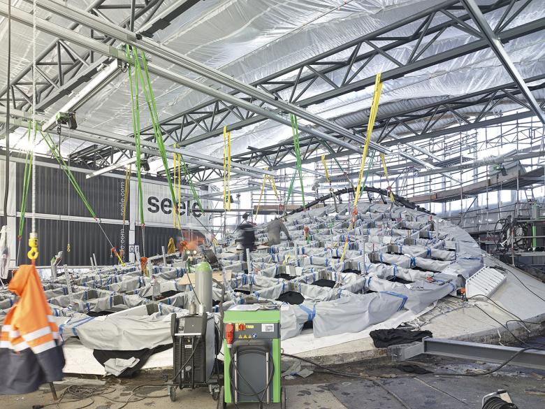A light eye is made up of 8 steel construction segments. Each segment is suspended and adjusted using chain hoists and heavy-duty belts over 3 lattice girders. The segments can then be welded together to form a steel mesh structure - at any time of year. This is because the assembly area above the light eye is completely covered. Sea freight containers form a container enclosure. These serve on the one hand as a supporting structure for the 3 lattice girders, which are important for fixing the steel construction segments, and on the other hand as a trailer for the roof construction.