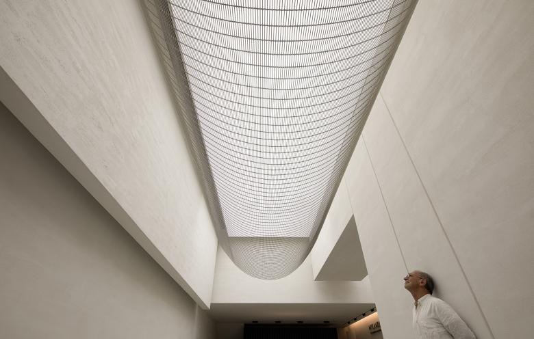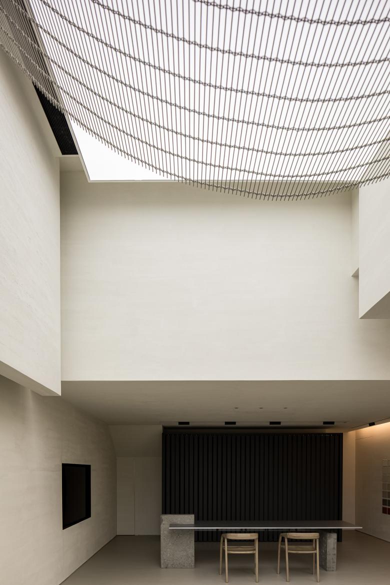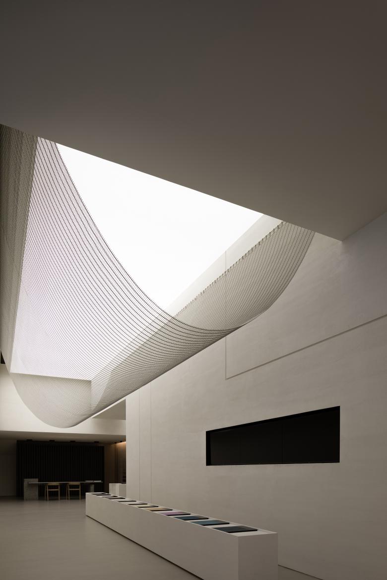 The transformation of the ceiling was based on full consideration of structures and pipelines. In this way, the design team produced a high ceiling, which makes the space appears lofty. The curved metal net hanging in the air and the stretch ceiling above together enrich the relationship between light and space, and evoke visitors' curiosity and desire to explore it.