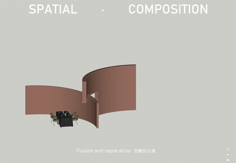 The space features a sense of uncertainty. The fusion and separation of different areas give rise to tangled emotions. The combination of geometry and arc, free plane and broken arc constitute a flowing spatial scene. With suspended form and tilted structure, the space produces a sense of uncertainty, lightness and elegance, filled with fun.