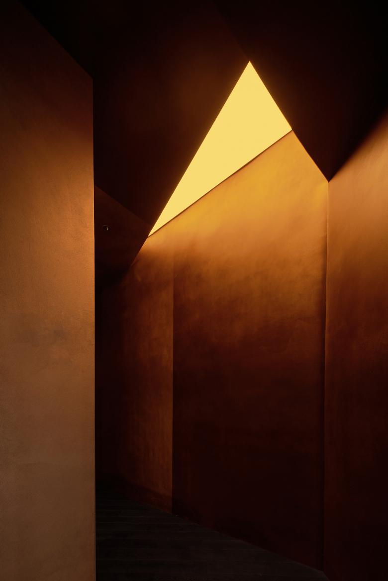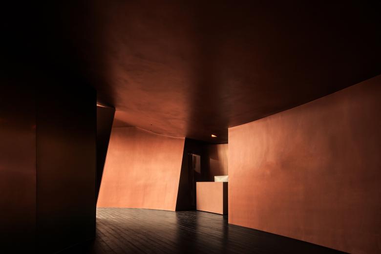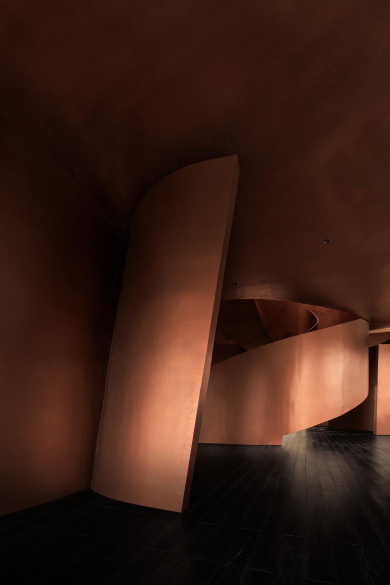 The space is unified by warm tones, showing a harmonious and gentle attitude. Through an innovative approach, the handmade paint is endowed with the matte texture of metal materials. It strikingly contrasts with wooden flooring, giving the space a warm yet futuristic touch.