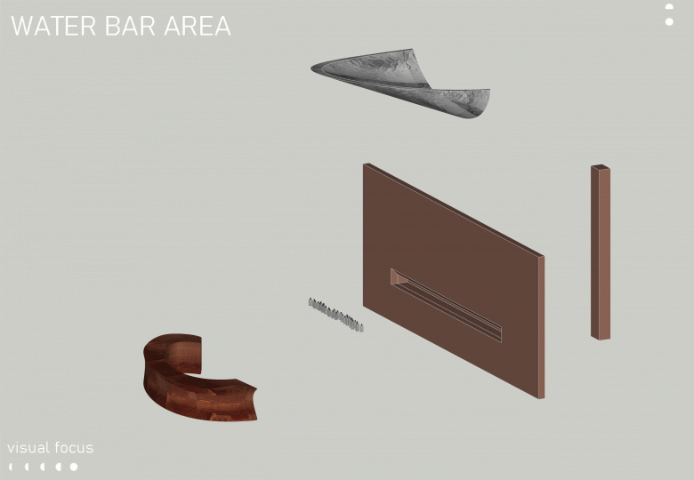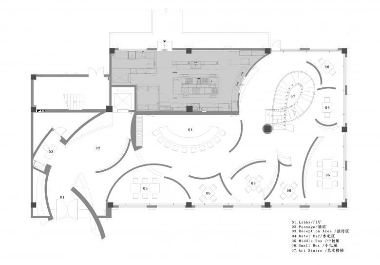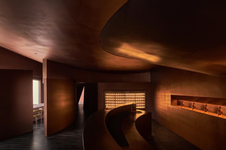 The bar area is set in the center of the restaurant, becoming the first visual focus. It can serve all tables, realizing the desired functionality and accentuating a romantic and naughty spatial emotion as well. Unlike many high-key and exciting bars, it is quiet and leisurely.