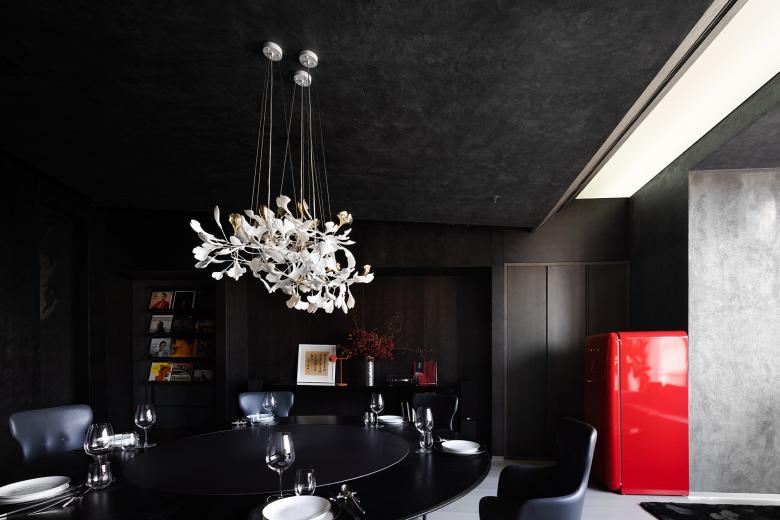 When the guests enter the entrance lobby, curved walls come into view and guide their lines of sight. The black sculpted staircase becomes the visual focus of the space. The structural column at the bottom of staircase utilizes glowing red acrylic, effectively floating the stair structure and keeping the form intact. The luminous side of the stairs effectively separates the steps from the handrail structure, thereby appearing more delicate and exquisite. A variety of famous wines and ancient books collected by Mr. Da Dong are displayed on the backdrop of stairs, showing his elegant taste and inner cultivation.