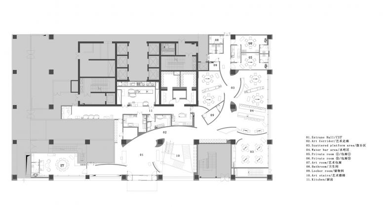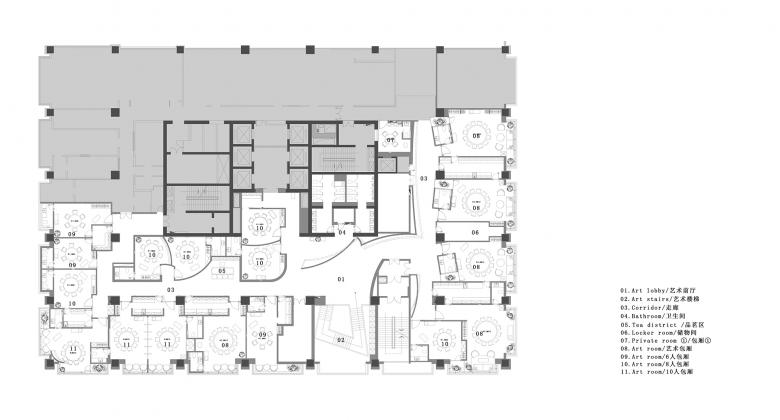When climbing the stairs to the second floor, structures that echo the arc-shaped backdrop wall on 1F come into view. Central tea bar area is set on the passage on 2F. It upgrades the restaurant's functions and details by offering professional and considerate services, which effectively reduces the number of staffs compared with tea tables placed in each private room.