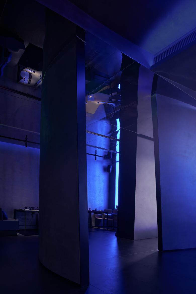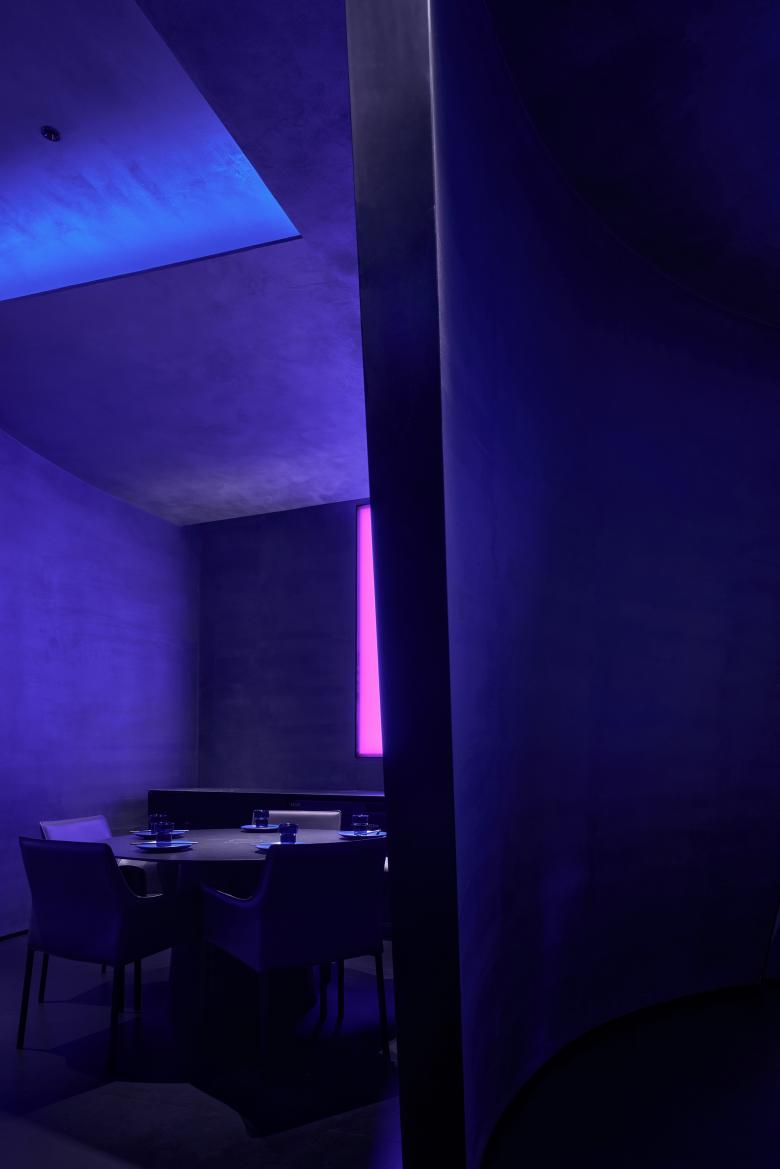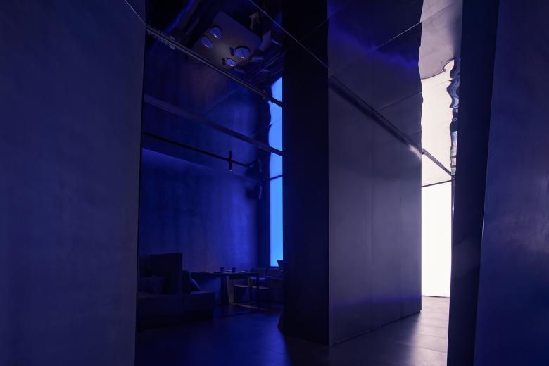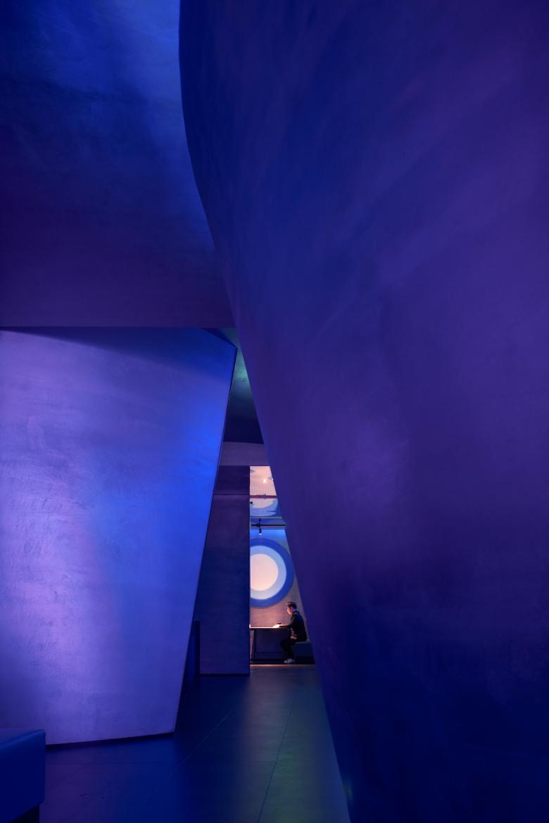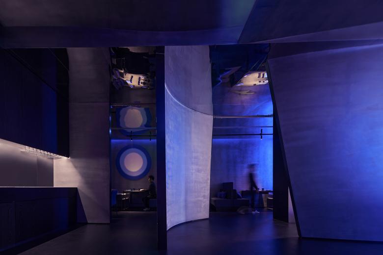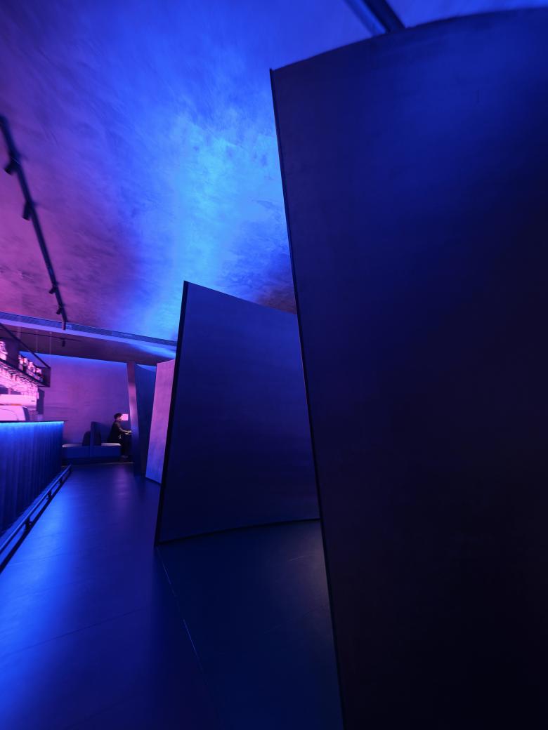 Cool blue lights are hidden among irregular blocks, bringing a breathing and vague ambience to the space. The pink neon light in the bar counter area forms a strong contrast with the blue light, generating an illusionary experiential scenario as well as a free, magical and radical artistic atmosphere.