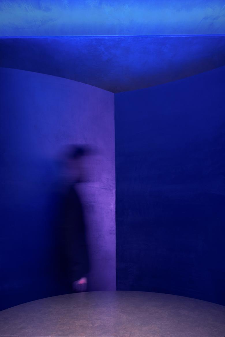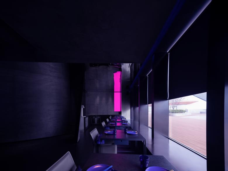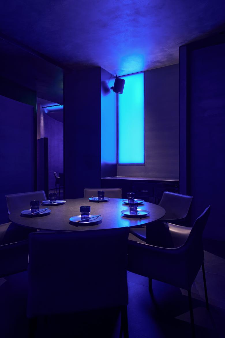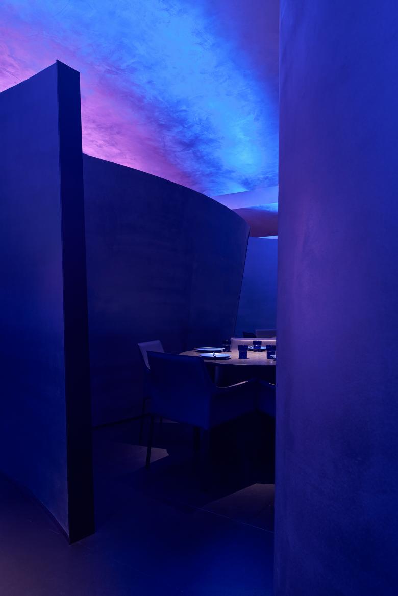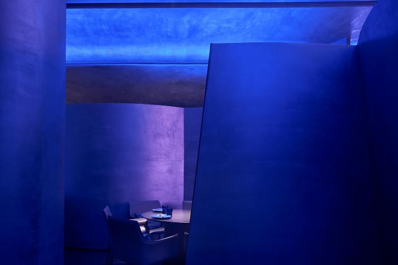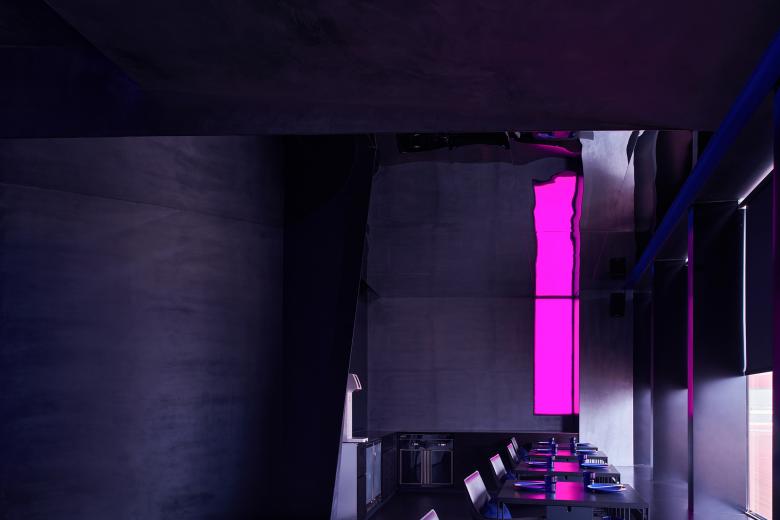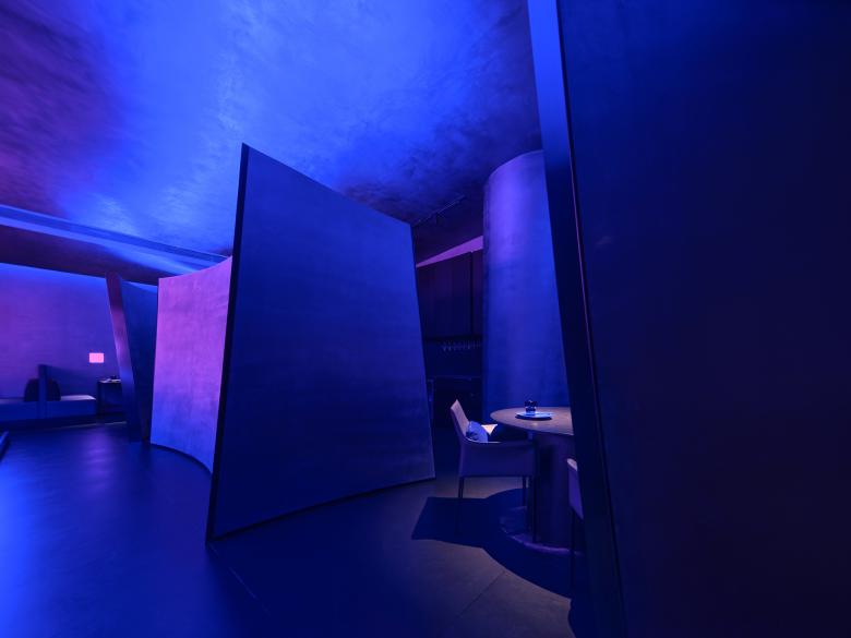 Cool blue lights are hidden among irregular blocks, bringing a breathing and vague ambience to the space. The pink neon light in the bar counter area forms a strong contrast with the blue light, generating an illusionary experiential scenario as well as a free, magical and radical artistic atmosphere.