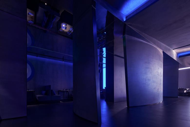 The curved screen walls function as partitions, which demarcate several independent socializing and dining areas. Their dramatic, powerful forms along with the cool lights create a dreamy ambience and convey the brand's avant-garde image as well.