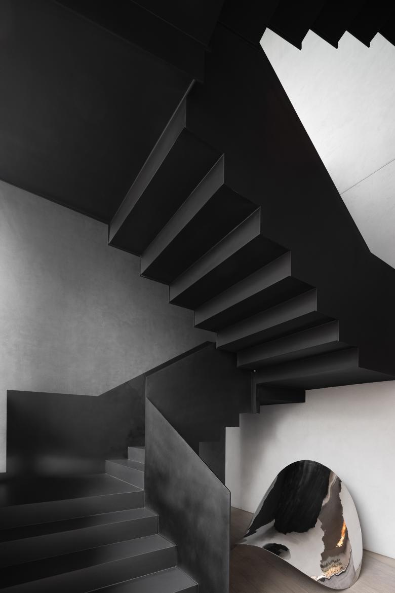 The first and second floors are connected by a sculptural black staircase. It creates striking visual experience while also guiding the guests, embodying a combination of both functionality and aesthetics.