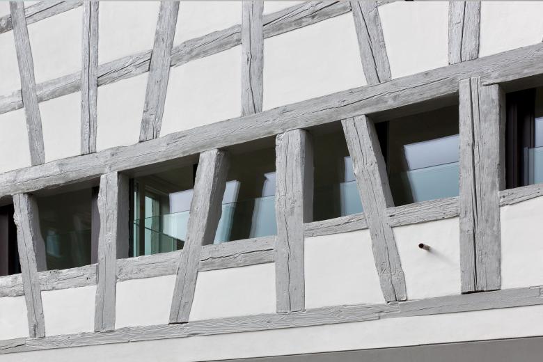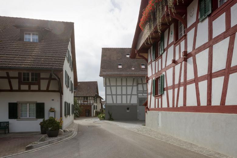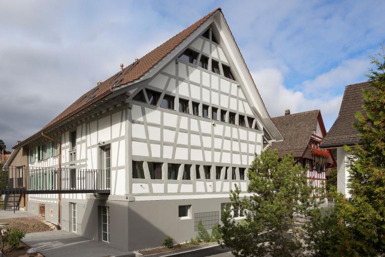 Das ehemals von zwei Personen aus der ersten Generation bewohnte Haus, wurde in ein Mehrgenerationenhaus ausgebaut. In Zukunft soll das Haus vom Musikerpaar zu Arbeits- und Wohnzwecken genutzt werden. Dazu gehören ein Musikaufnahmestudio, Übungsräume und eine Zwei - Personenwohnung im Erdgeschoss sowie eine Familienwohnung in den Obergeschossen mit einem direkten Aussenabgang in den bestehenden Bauerngarten. Der Entscheid, das Musikstudio aus akustischen Gründen im Untergeschoss zu realisieren, machte ein vollständige Demontage und Wiedermontage der Riegelfassade zwingend. Die neuen beheizten Volumen wurden vollständig in Holz gebaut und auf das neue Kellergeschoss aus Beton gestellt. Die rekonstruierte Riegelfassade ist der Holzinnenwand dreiseitig unabhängig vorgesetzt. Die Hauptaufgabe dieses Umbaus bestand darin, eine Transformation der Fassade zu vollziehen ohne den Charme des Gegensatzes zwischen der fensterlosen Scheune und dem befensterten Wohnteil zu verwischen.Die Wohnung im Obergeschoss ist mit einer Brücke, die zugleich die Tragkonstruktion für den Sonnenschutz der darunterliegenden Terrasse bildet, und einem Treppenabgang mit dem Garten verbunden. Das äussere Erscheinungsbild des Hauses steht unter Denkmalschutz und wurde in enger Zusammenarbeit mit den Behörden entwickelt.