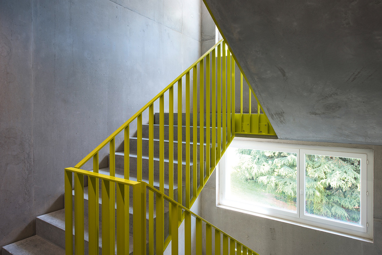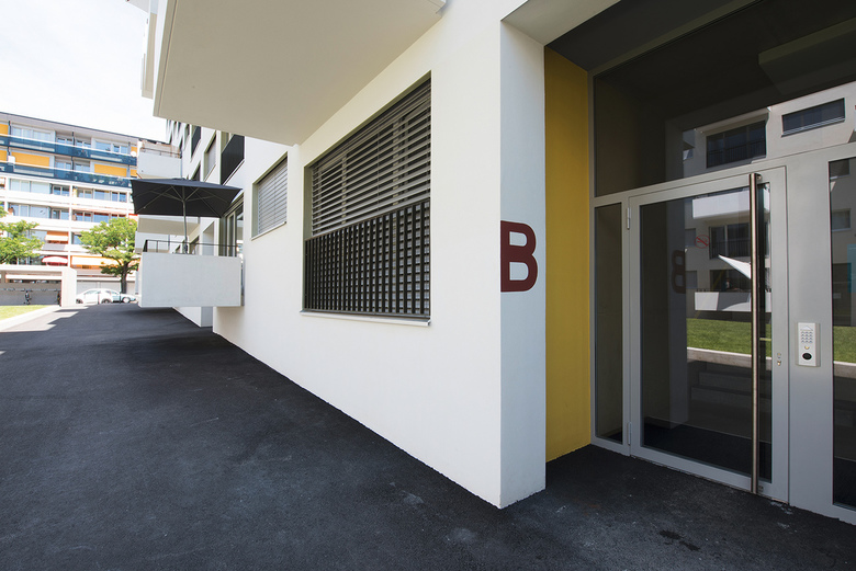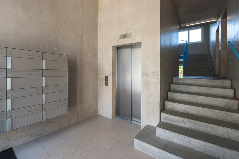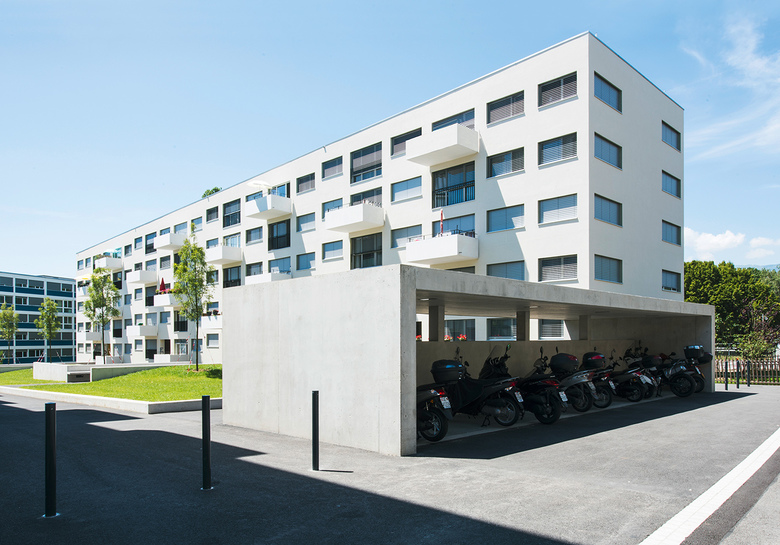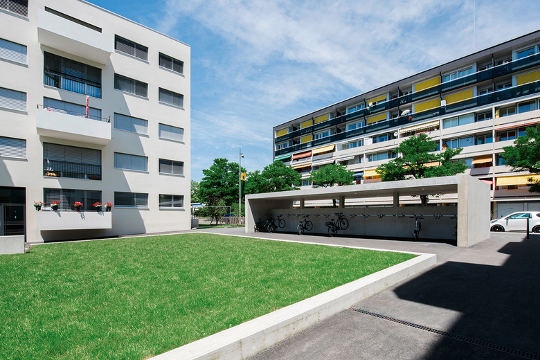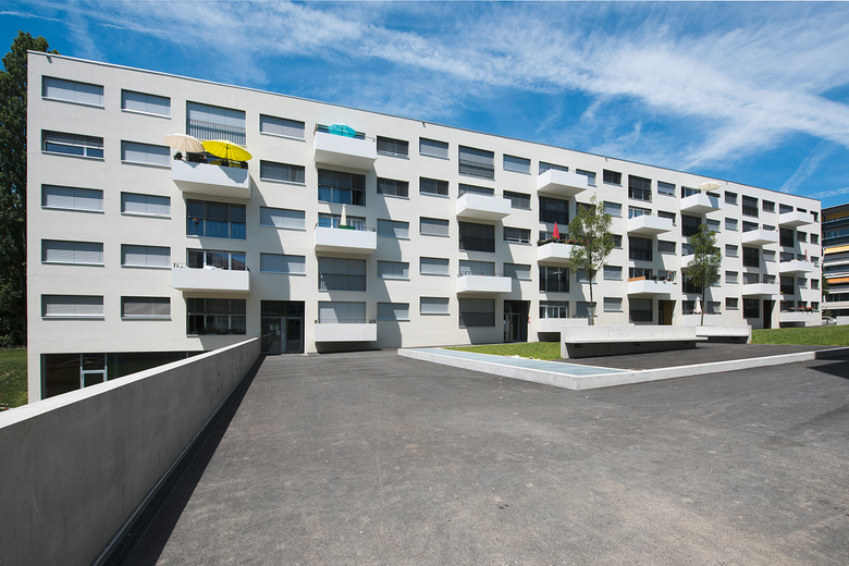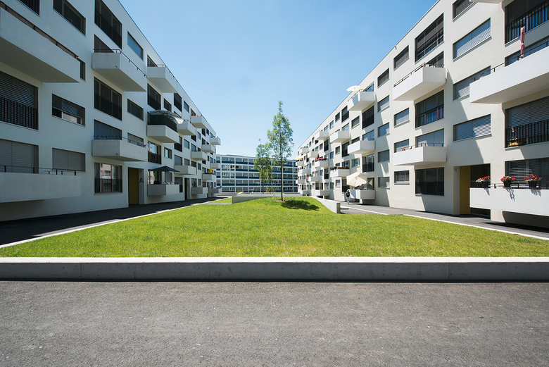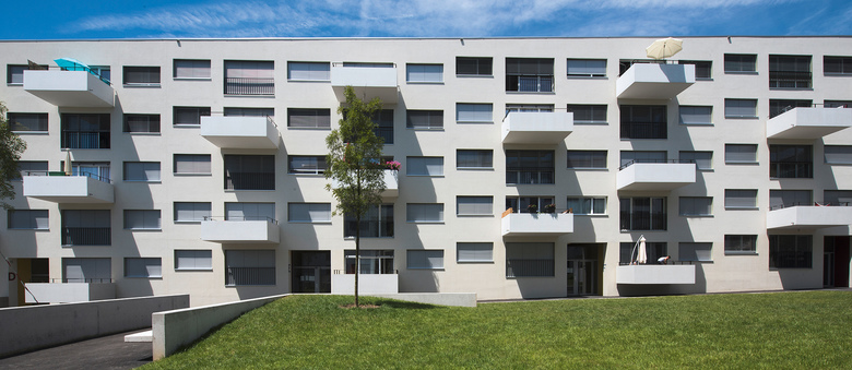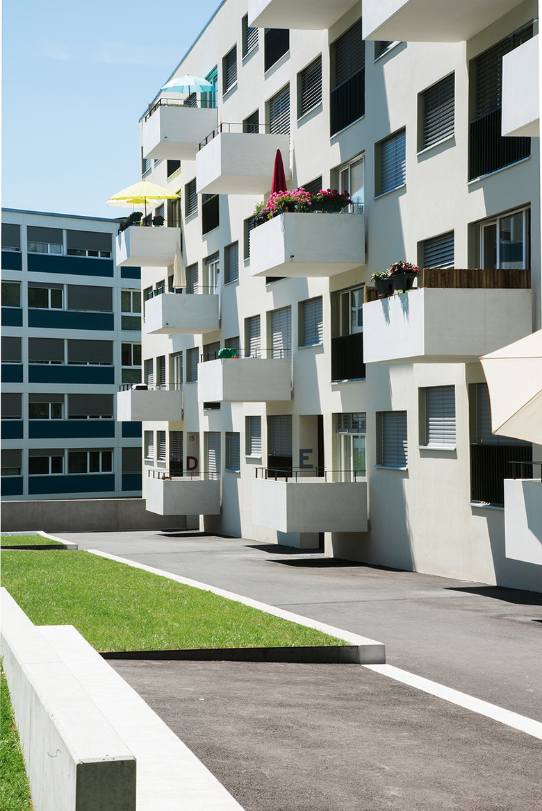 Beide Gebäude sind auf einem Raster aufgebaut, der eine kostengünstige Vorfabrizierung von Küchen und Bädern erlaubt. Auch die Fassaden bestehen aus einheitlichen Elementen. Jedes Gebäude ist in gegeneinander verschobene Blöcke unterteilt. Die dazwischen liegenden Erschliessungsräume sind als Aussenräume konzipiert. Die Wohnungsgrundrisse erlauben eine flexible Planung; sie sind durchgehend angelegt und beziehen so die Terrassen mit ein. Indem die Fenster geschosshoch angelegt sind, ist der Aussenraum zusätzlich mit den privaten Räumen verschränkt.