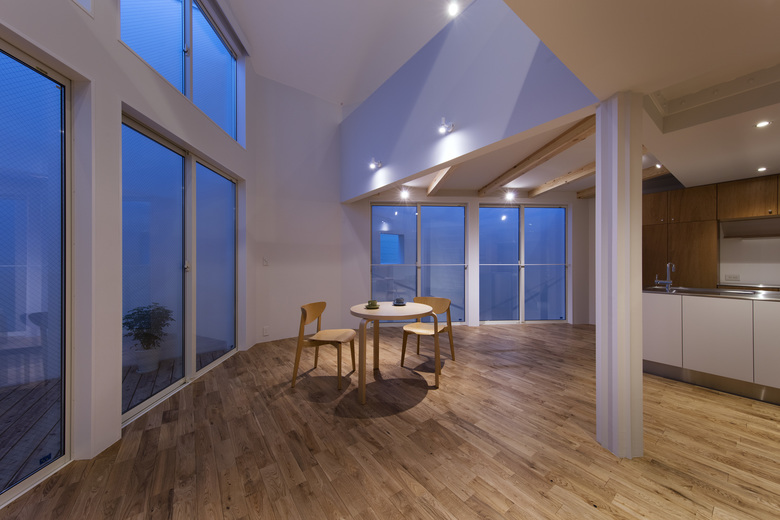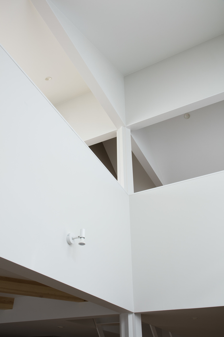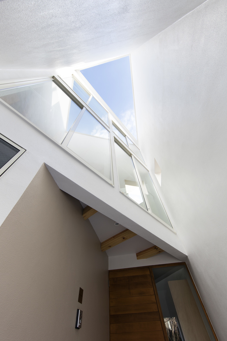 As the sight from the house is not blocked by curtains, the wall of the outer square can be perceived as the wall of the interior, giving the impression of larger space than the actual floor area. Inside the outer square, the walls are painted in mat white color, so that the light pouring through the four right triangle walls is mildly reflected on the walls.