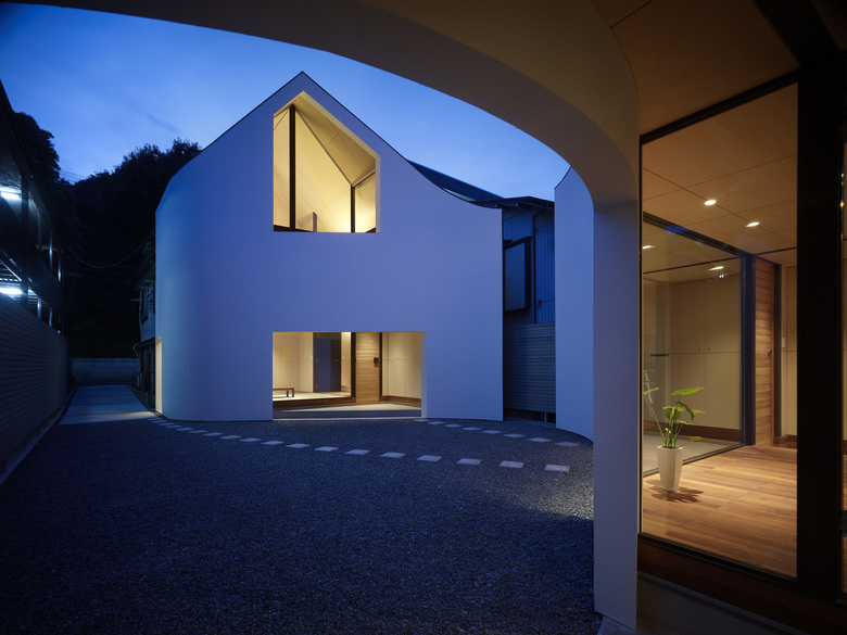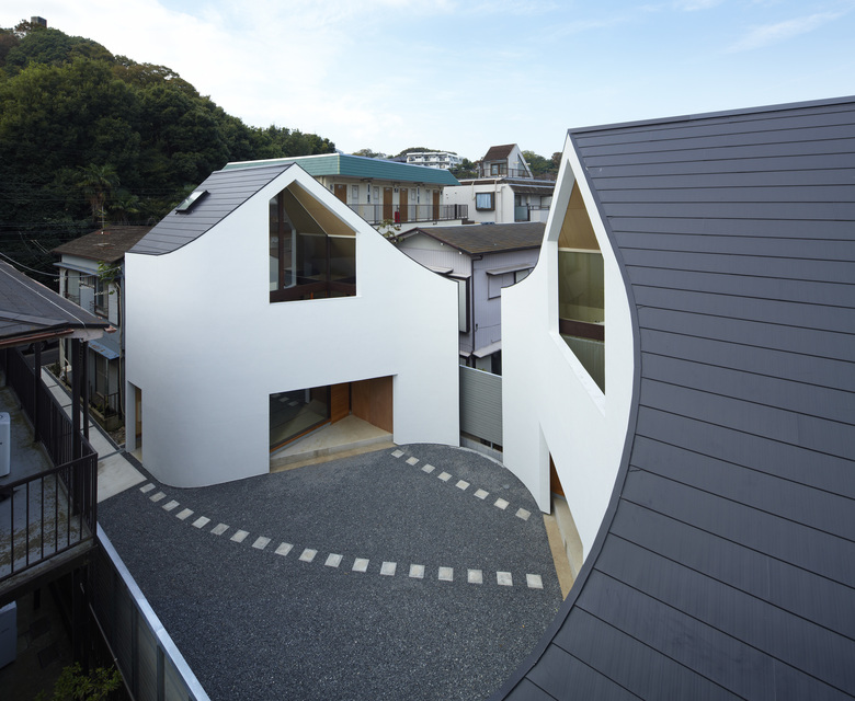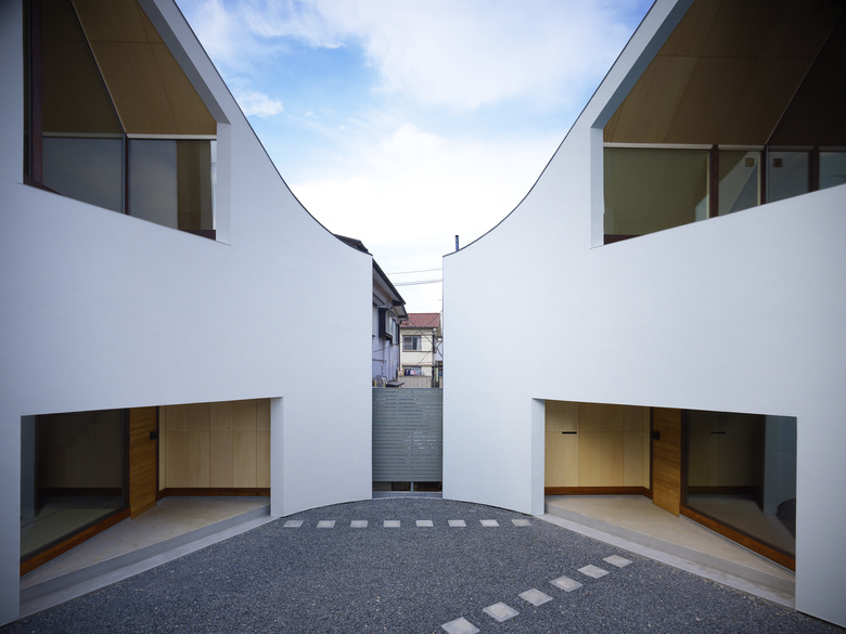 One great volume of a house which covers the entire plot was supposed first. Then this volume was carved in a curve in three segments and two volumes at the both ends were built as two houses on the site.