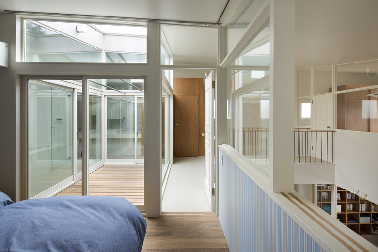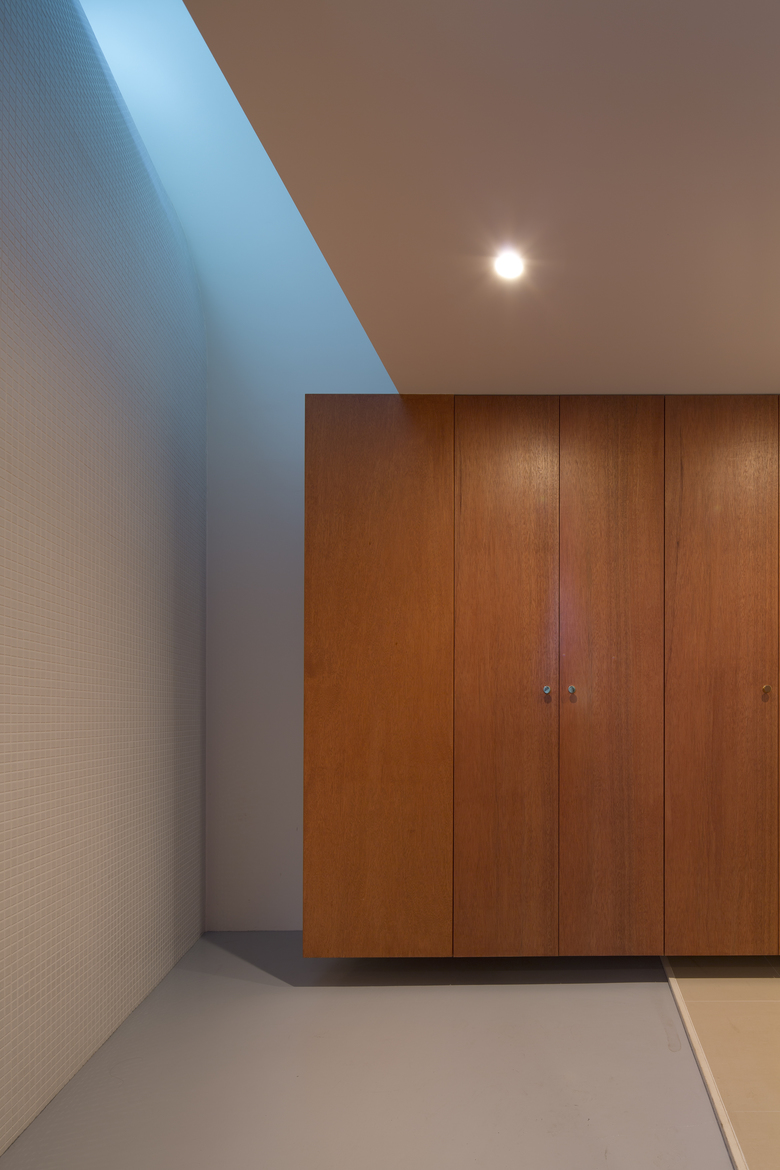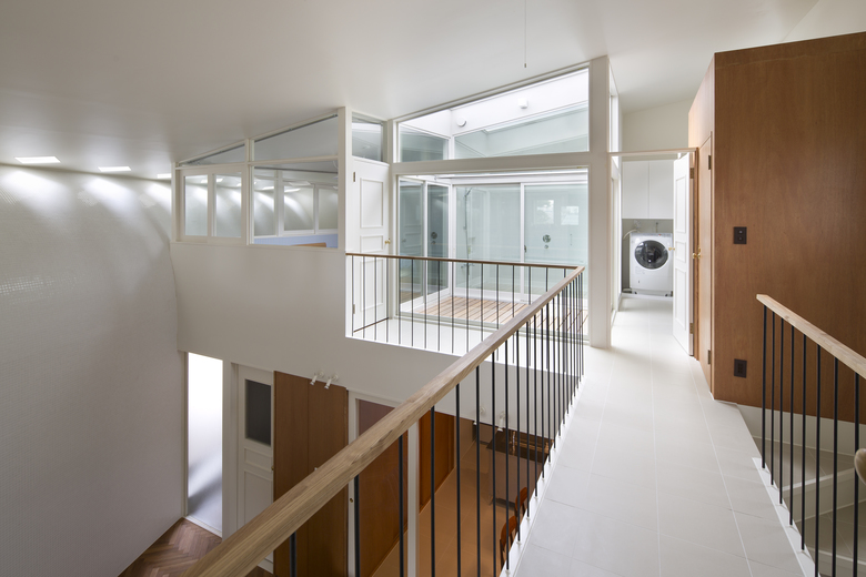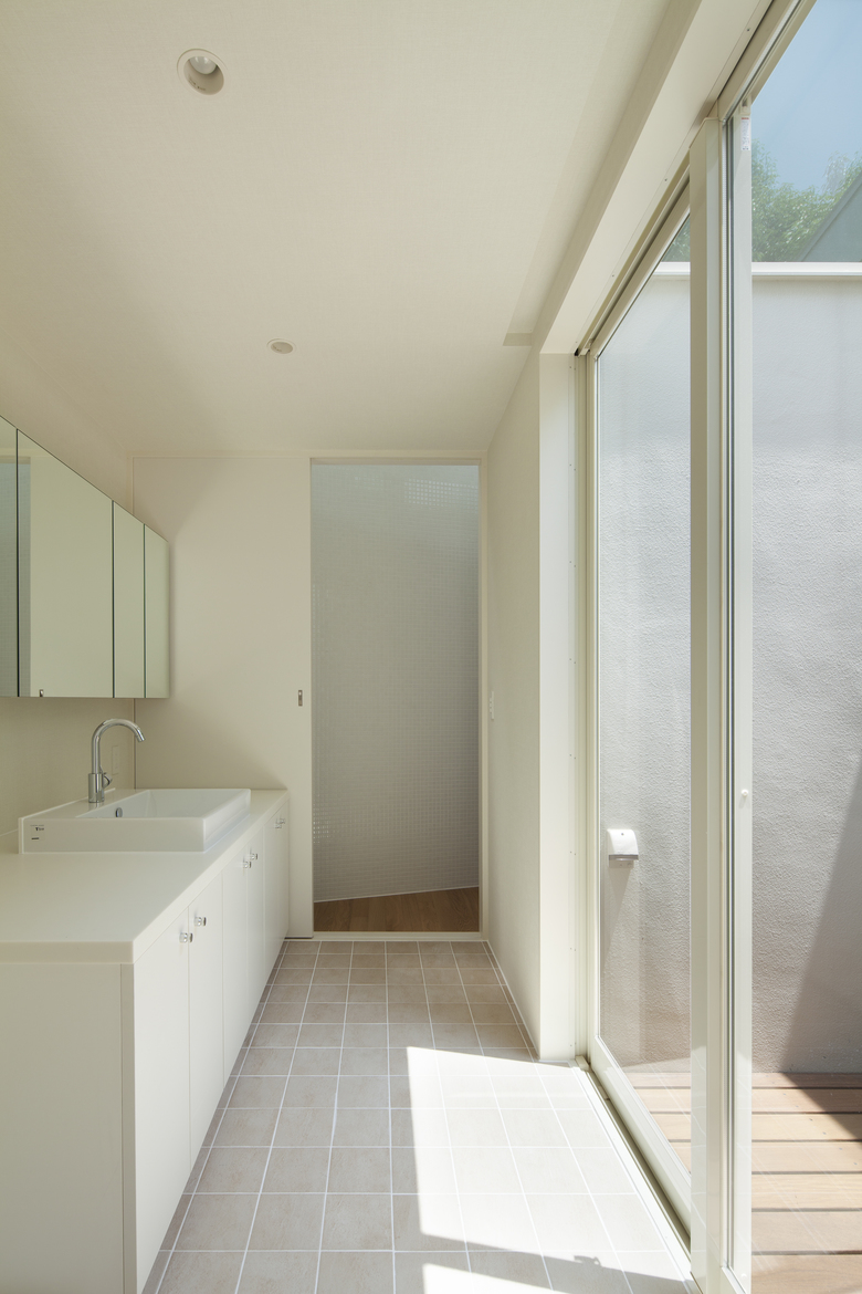 The courtyard has the largest daylight windows to provide light through transom windows and slanted ceiling. Daylight from skylight is reflected on ceramic tiles on the curved walls to give different effects by the time and weather; when sunny, it is sharp, when cloudy, it is soft, and in the morning and evening, pale violet blue light spreads inside.