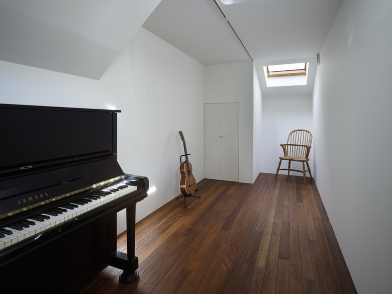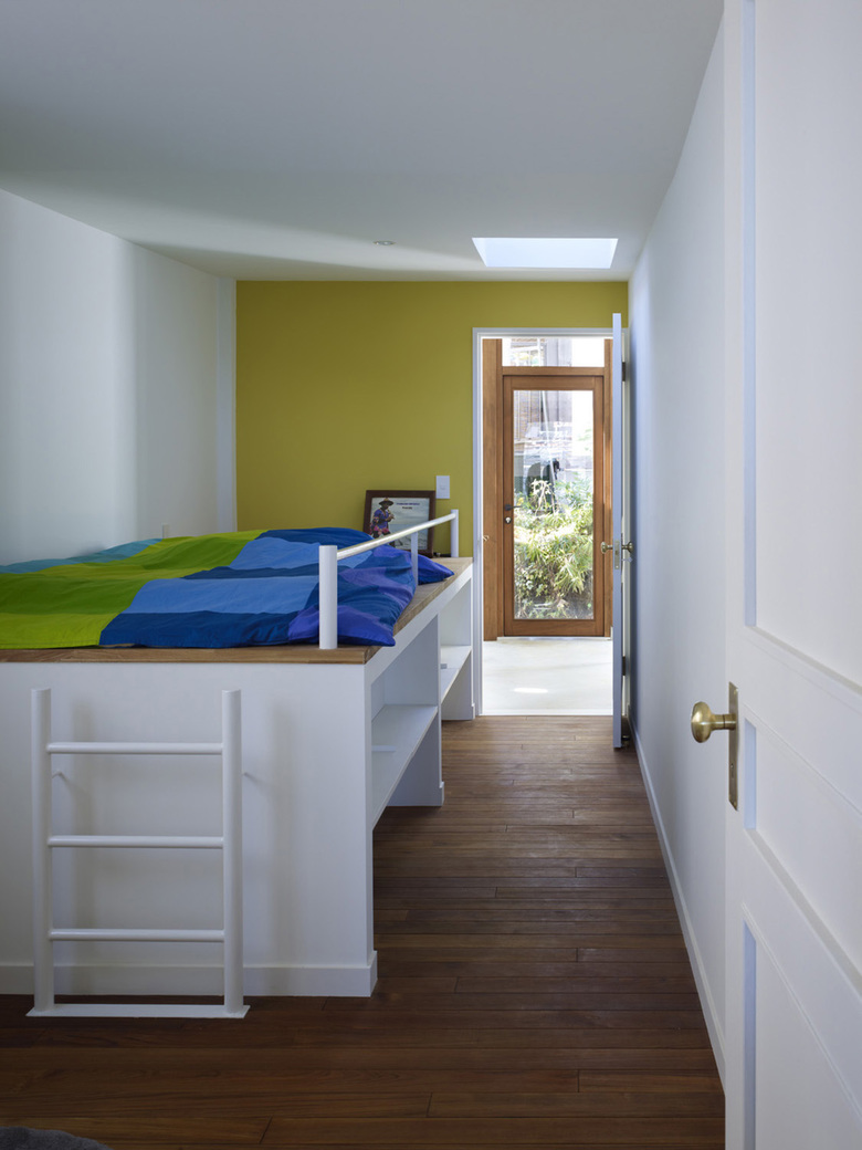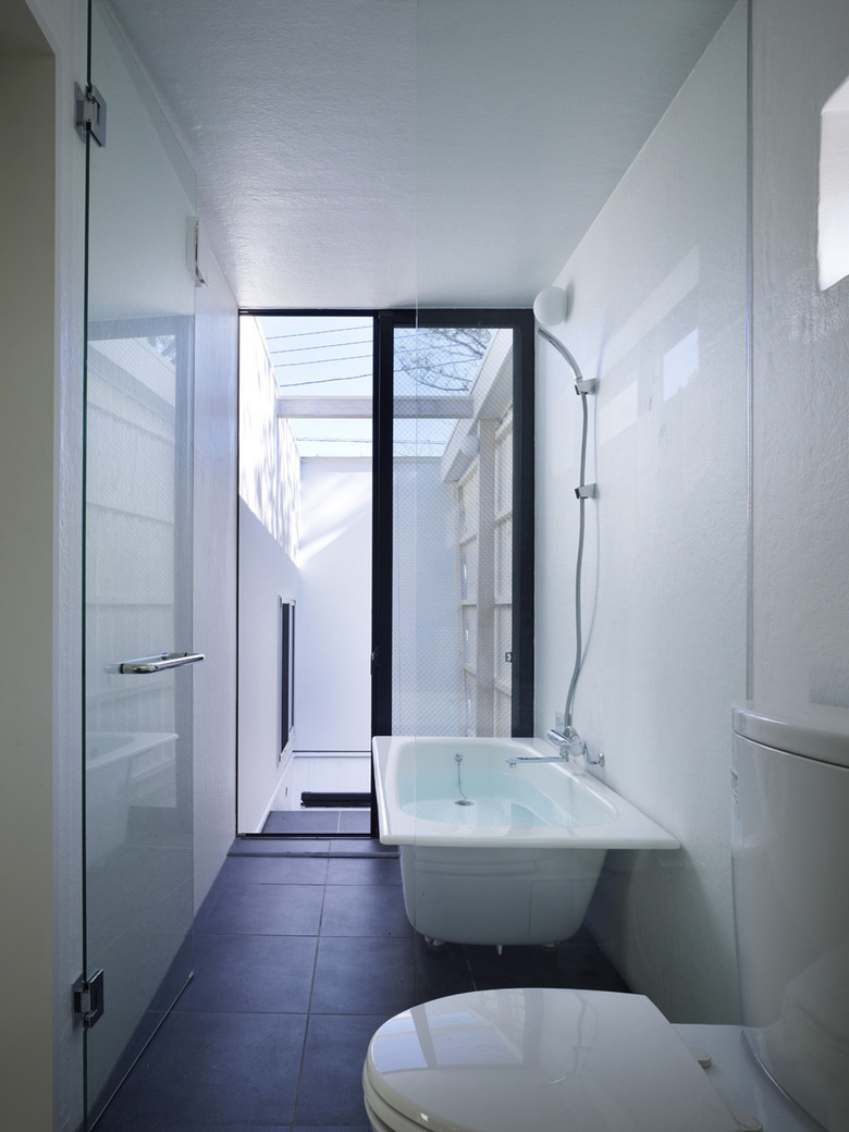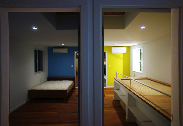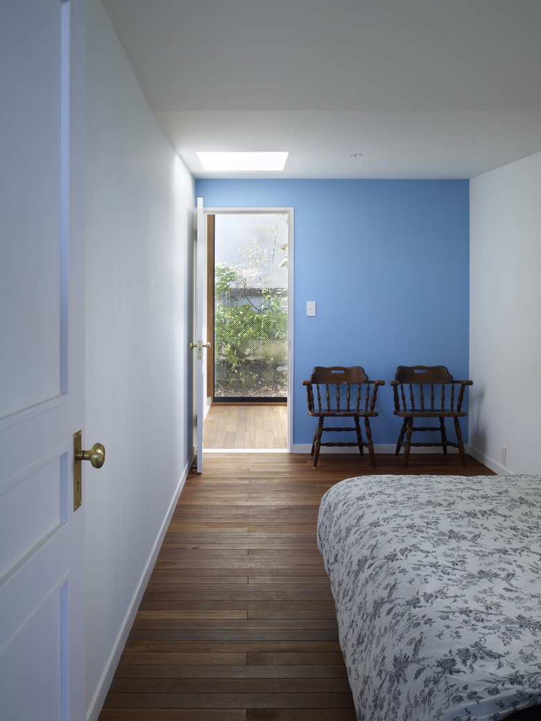 The centre of the tunnel-like house between the east and west living rooms has lower ceilings, making them the most private bedrooms (master bedroom and child’s room). Windows in the bedrooms were reduced to secure privacy from the surroundings and light is mainly taken in from the top lights. Walls are painted in blue for master bedroom and yellow for child’s room.