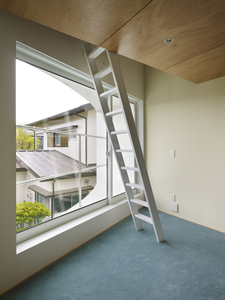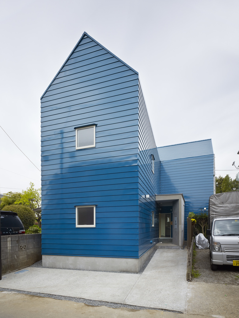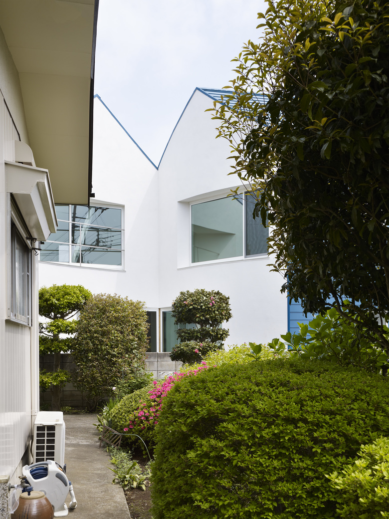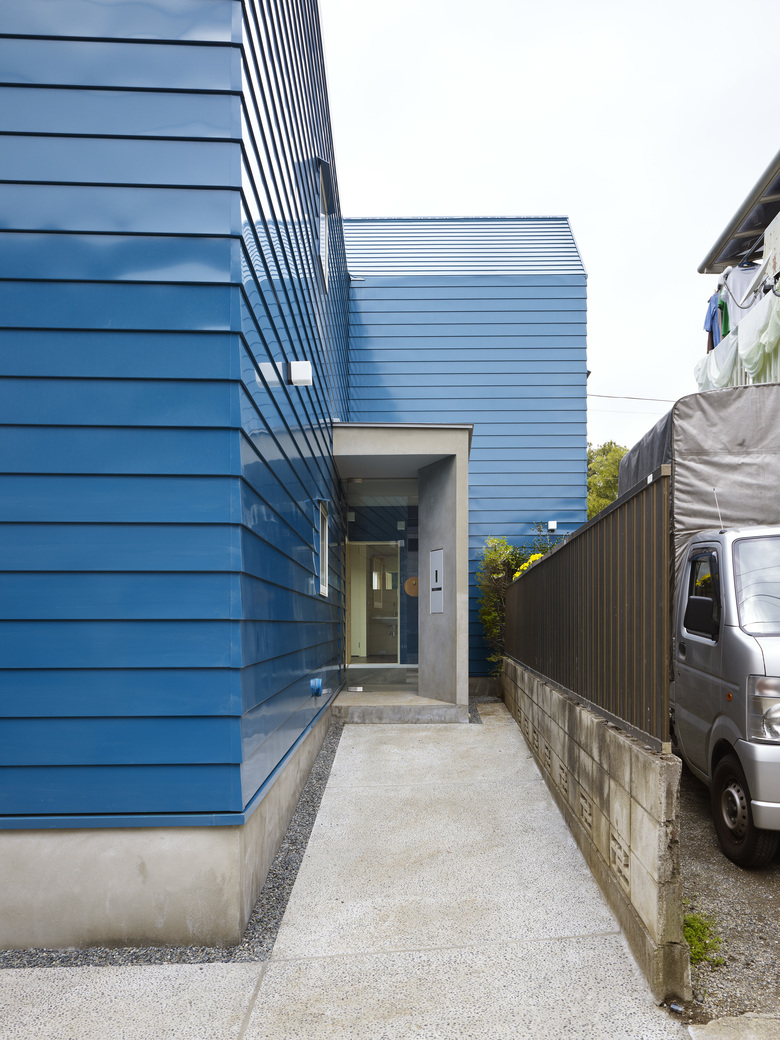 The yard, where the couple and their neighbors exchange greetings, is covered with soft lawn. The entrance, which accepts all kinds of guests, has whisper concrete finishing which gives more formal impression.