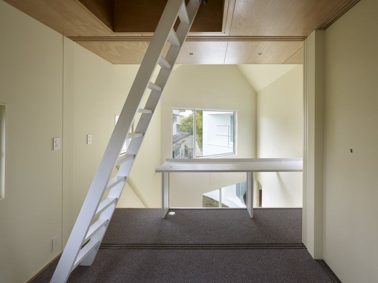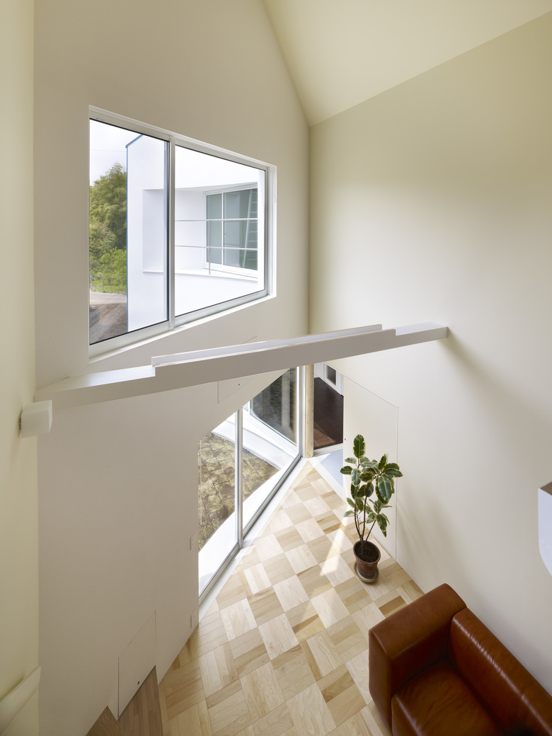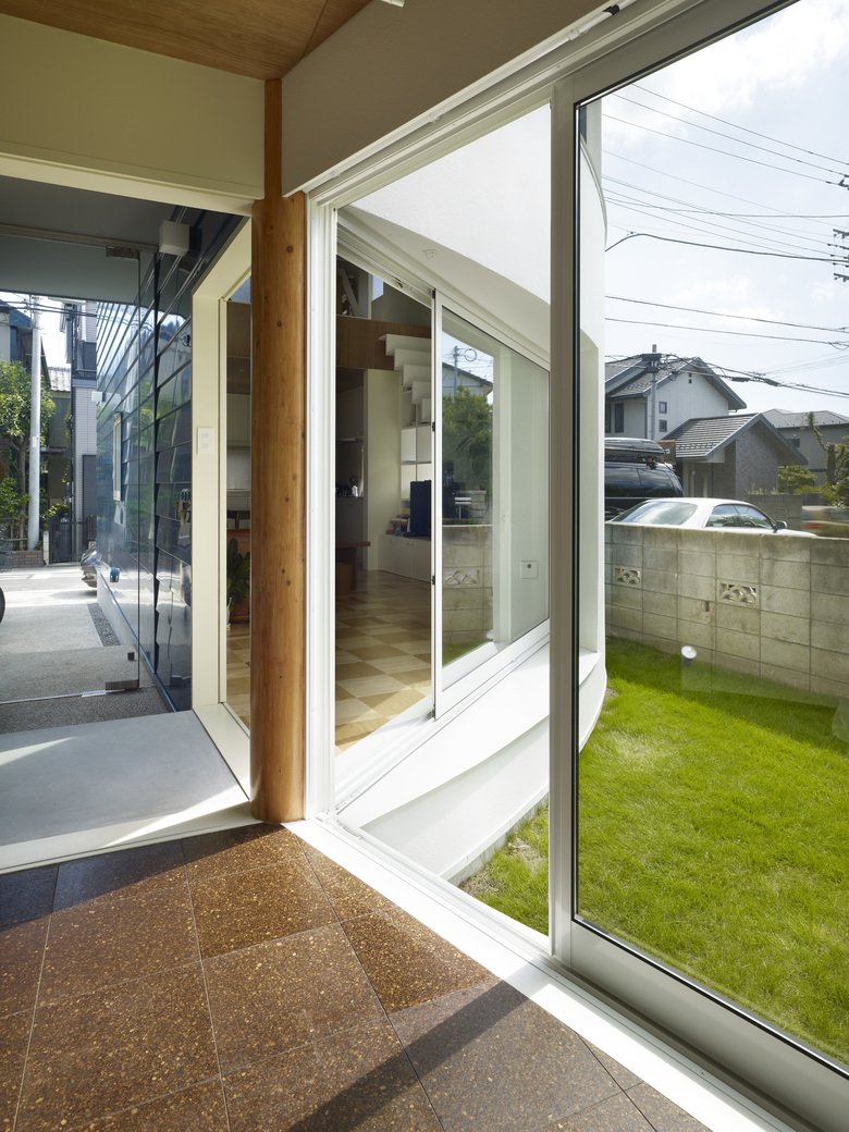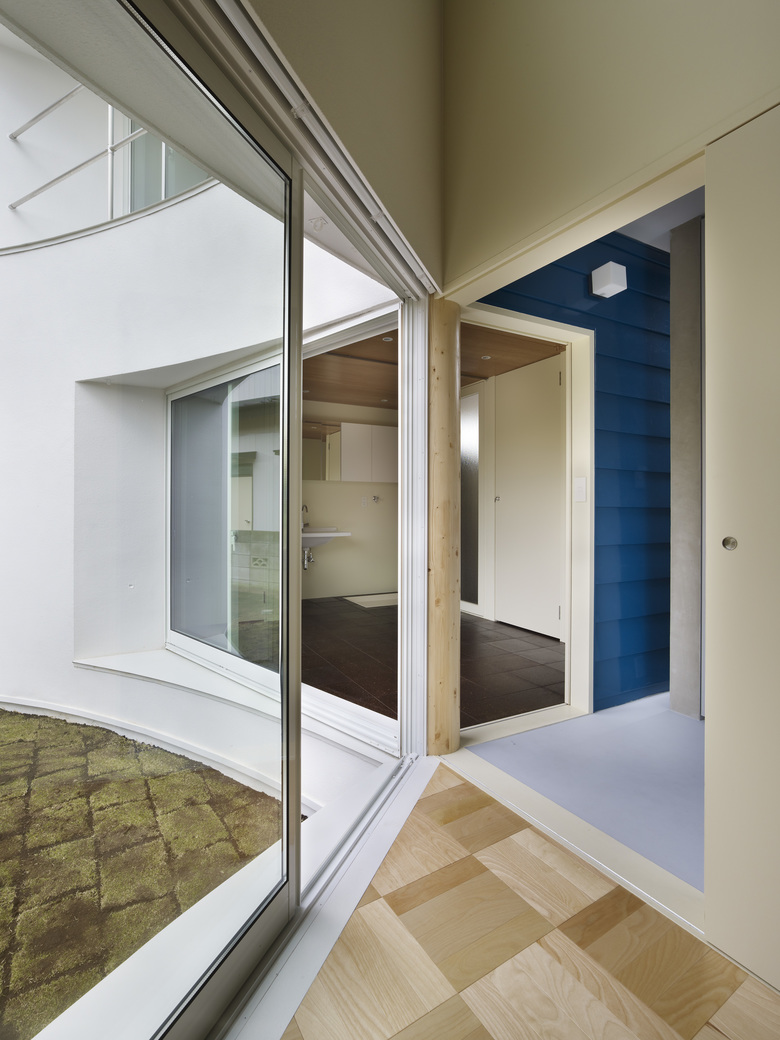 A column stands at the adjoining corner of the two buildings, and four zones, yard, entrance, small and large buildings, are placed radially. Four zones can be shared or partitioned using sliding doors.