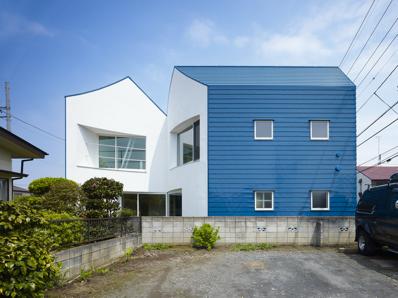 Two buildings, large and small, stand on L-shape plot adjoining at the corner. The form of the two buildings comes is as if one building snapped in two, and they are placed along the shape of the site.