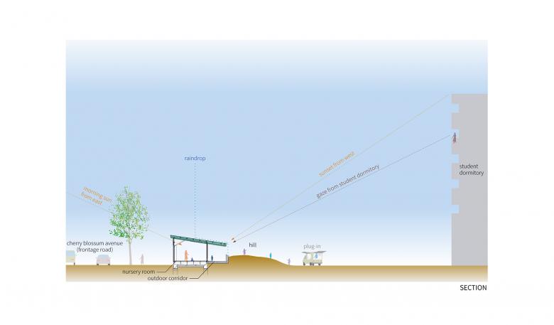 The university’s central plaza is the hub of campus circulation, and is literally the center of university activities, serving as the main venue filled with stalls for events such as university festivals. Creating “another plaza” to the university’s central plaza was the concept of designing the nursery school which was intended to add a “childcare” activity at the end of the tree-lined avenue that extends from the central plaza. The basic design principle is to restructure the space by placing a low-height wooden school building as part of the abandoned hill and to turn the childcare activities into a landscape beyond the tree-lined avenue. We could sense this concept is being nurtured through the bustling first anniversary celebration.
