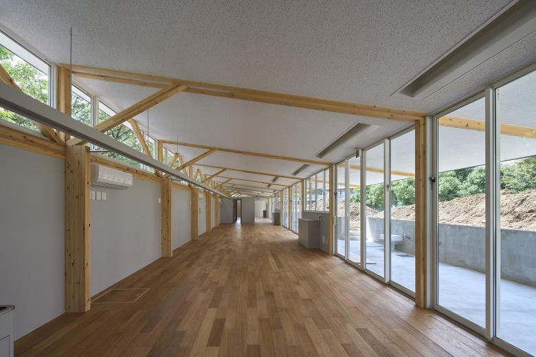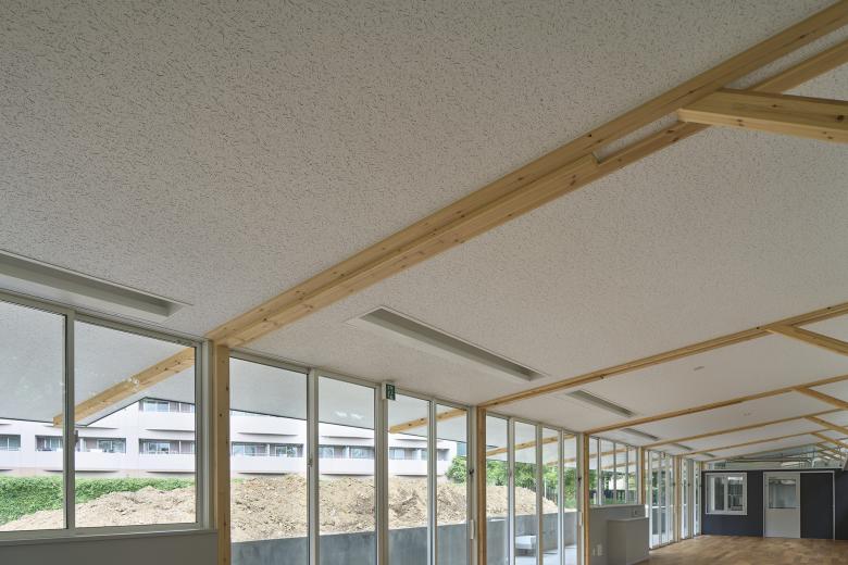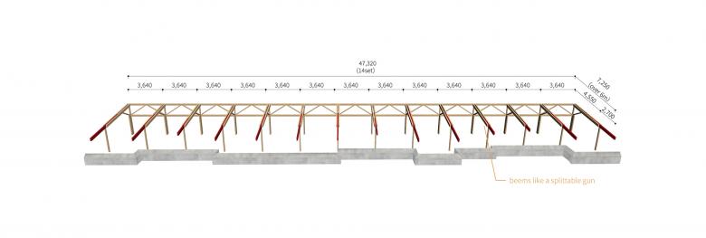 The structure is made of wood in consideration of versatility and cost, and the cross section and length (6m or less) meet residential standards. The short side of the nursery building is 4.5m, but the eaves that extend from it are a maximum of 2.7m, and the total length exceeds 6m, so the length can be adjusted by sliding a beam held at the tip like a “chopstick gun”. This allows the eaves, which have different lengths depending on the crank, to be supported by the same structural unit. This unit was repeated in 14 sets over the 47m long length of the building, and was used as the interior design.