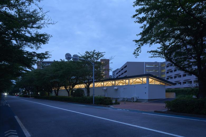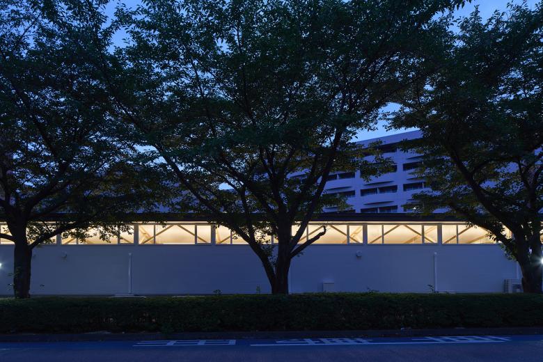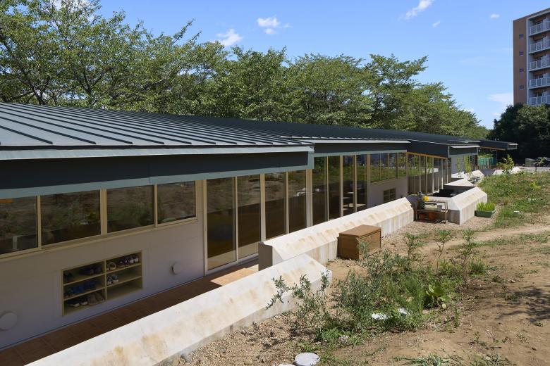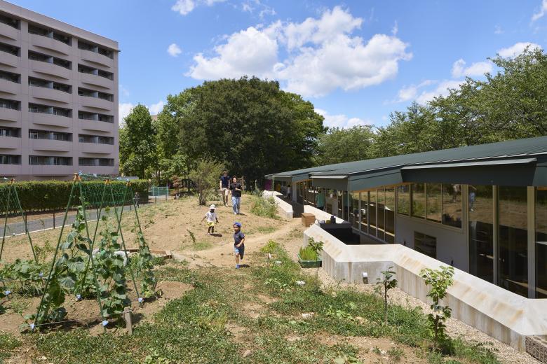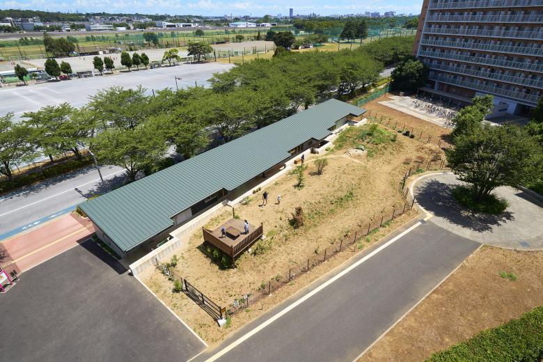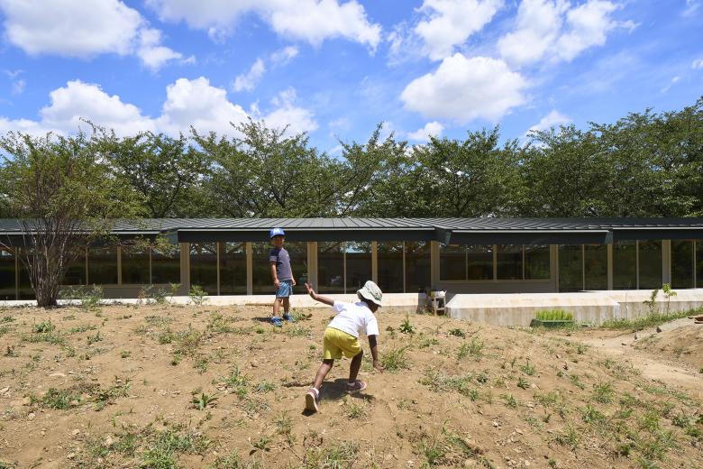 It is common for nursery schools to build artificial hills in their gardens, and after consulting with the director, we decided to use an existing hill as an artificial hill. The assumption is that the entire garden is an artificial hill and would be positively used as a three-dimensional field to accept the activities and imagination of the children. In order to reduce the amount of soil removed during construction, the school building was built away from the center of the hill, moved to the side, and stretched along a road in front which is lined with cherry blossom trees. The roof of the nursery building is kept low so that when you stand on the hill, you can see the surrounding trees and scenery.