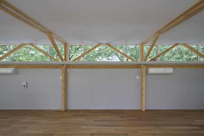 Facing the hallway, there are many sliding door sashes that allow access from many places in the room. On the front road side opposite the hallway, a high window sashes were installed just below the roof in a position where branches of the cherry blossom trees can be seen. The long side of the nursery building is 47m, but the short side is only 4.5m, so if you open the sashes on both sides, you can ensure ventilation in 4.5m. In the summer, the rows of cherry blossom trees provide shade from the morning sun coming from the east, and in the winter, when the leaves fall, the sunlight reaches indoors. The eaves and the adjacent student dormitory block the sunset from the west.