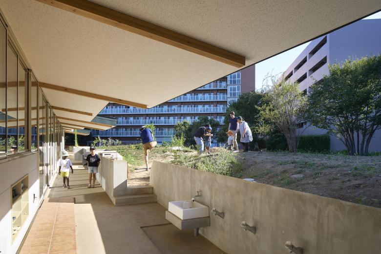 There is an outdoor hallway under the eaves of the roof, and a retaining wall separates the hallway from the hill. In order to minimize the earthwork, we opted to narrow hallway where hill is high and amount of soil is large by pushing retaining wall toward the building and broaden the hallway where hill is low. However, due to operational requirements, the hallway was broadened where wide hallway was requested to put sofas for children to gather or there is a lot of traffic and narrowed in front of the playground for children aged 0 to 1 to ensure safety. The location of the earth retaining wall was considered in order to balance both conditions. As a result, the hallway and the hill are connected by earth retaining walls that are cranked at seven locations along the 47m length of the building, and the eaves are also extended and cranked accordingly. To prevent rain from entering the hallway, the top edge of the retaining wall was cut diagonally toward the hill.