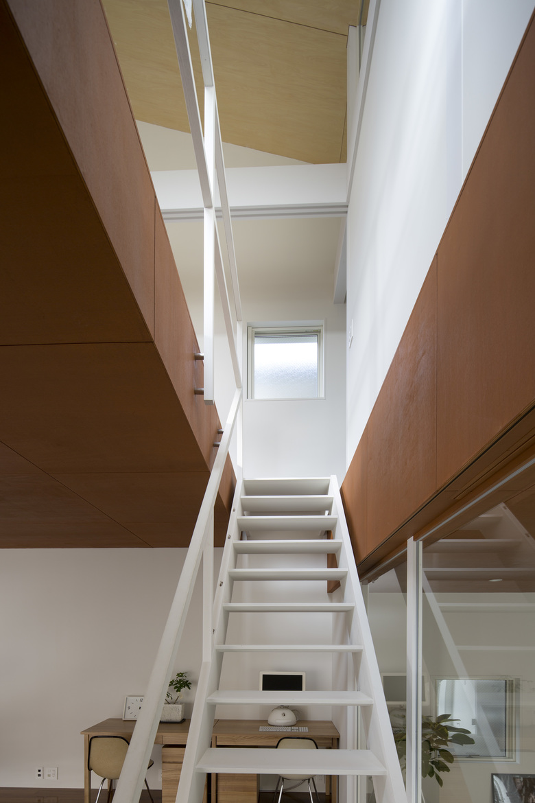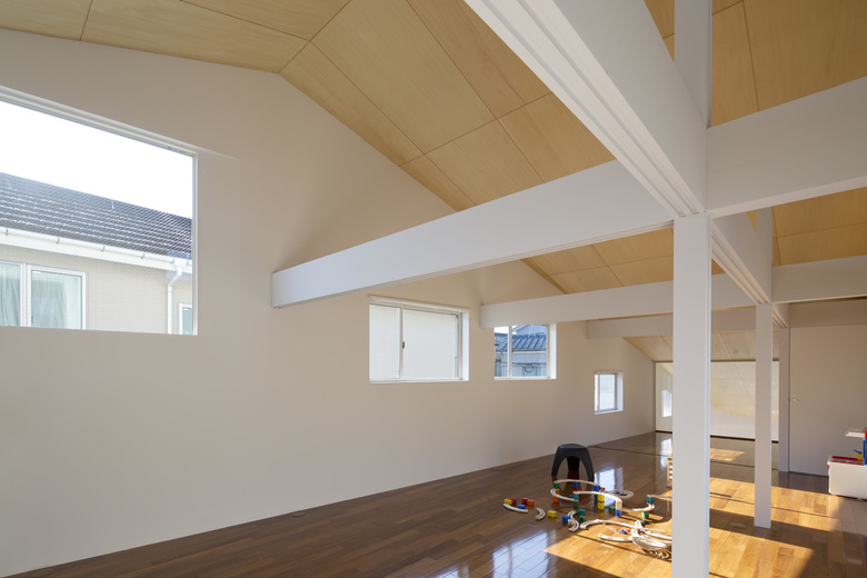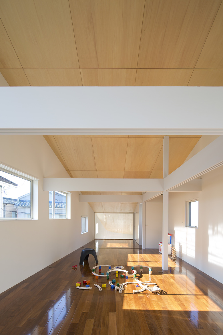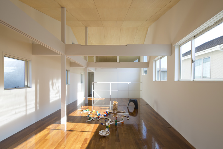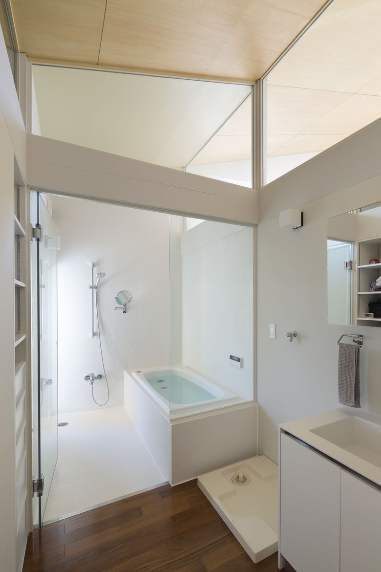 On the second floor, distanced from the private road, sunroom, bathroom, bedroom, and guest room are located for more private function. In Niigata, a region of much rain and less sunshine, people tend to spend time indoor, and the sunroom serves as open quasi-outdoor space under high, big roof. It is a sunny space where laundry is hung to dry, children play or it serves for other purposes. Abundant sunshine in sunroom is sent to bathroom through fanlight. The bedroom and guest room are placed near eaves where the ceilings are lower and more cozy.